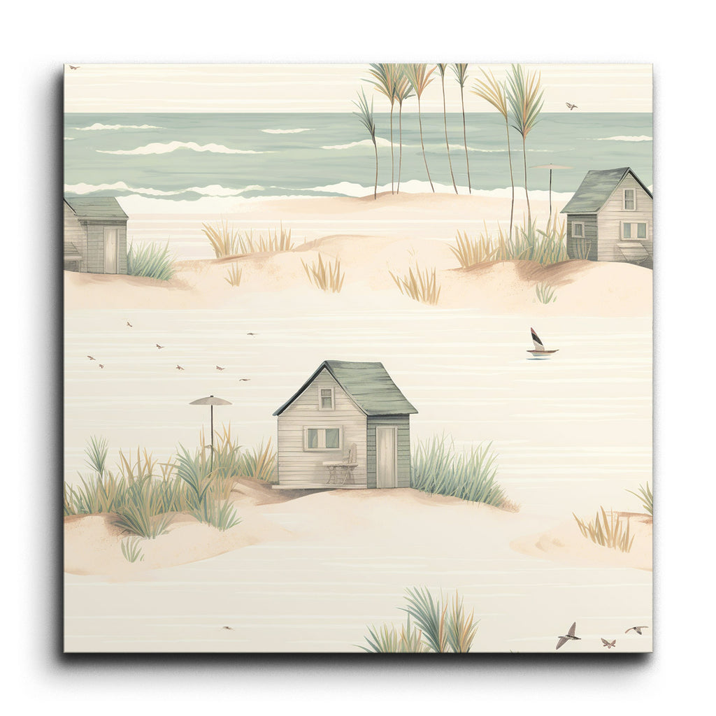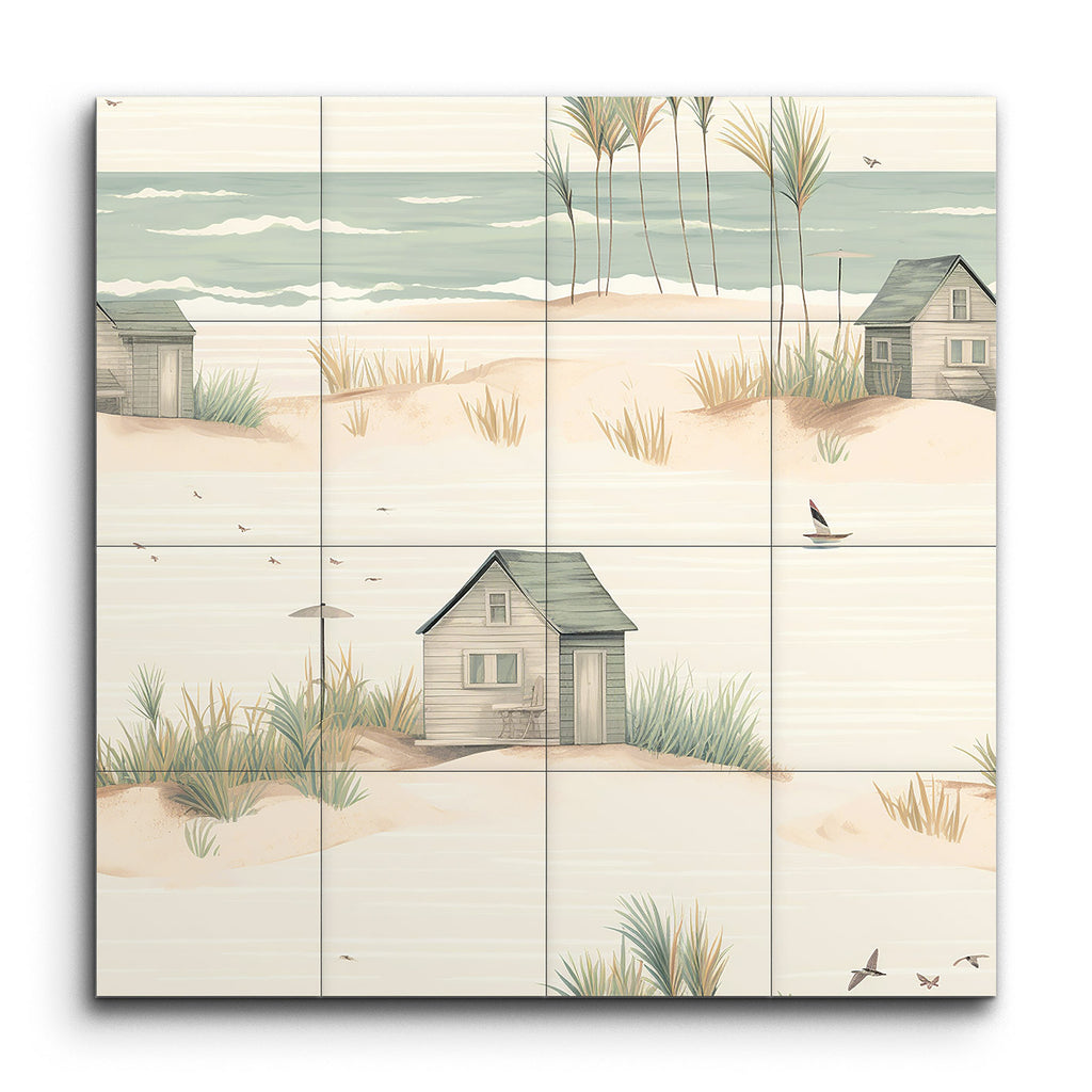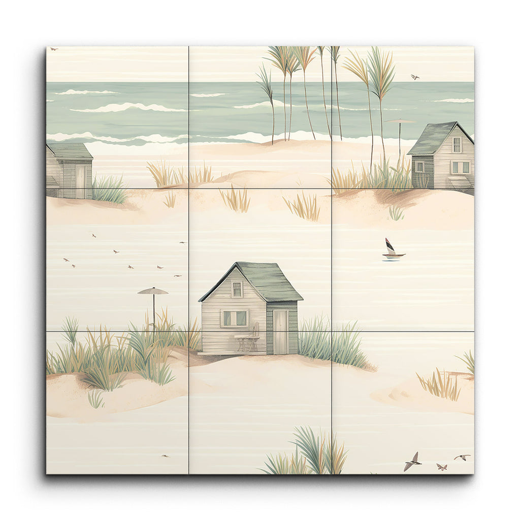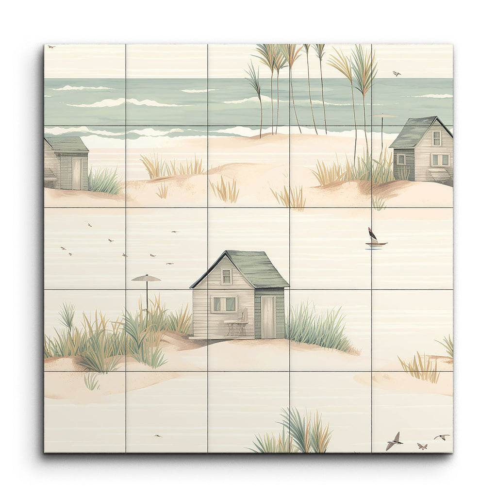 Trasforma il tuo spazio con questo incantevole murale in piastrelle, che presenta una serena scena costiera che cattura l'essenza di un tranquillo rifugio sulla spiaggia. L'opera d'arte minimalista e fantasiosa mostra una spiaggia sabbiosa adornata con dolci dune, ciuffi d'erba sparsi e affascinanti capanne da spiaggia rustiche in toni pastello tenui. Toni di beige soffice, verde chiaro e blu pallido creano un'atmosfera da sogno, mentre linee delicate ed elementi armoniosi evocano un ambiente pacifico e idilliaco. Perfetto per portare un tocco di calma costiera in qualsiasi stanza.