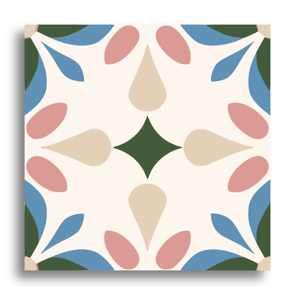 This decor tile showcases a captivating symmetrical pattern with fluid, organic shapes that suggest movement and rhythm. Its color palette harmoniously combines warm earth tones, such as terracotta and ochre, with cooler hues like blue and cream. The design nods to traditional encaustic tiles but introduces a modern flair through its abstract and dynamic forms. The intricate yet balanced motif offers a visually engaging experience, adding a touch of elegance and sophistication to any space.