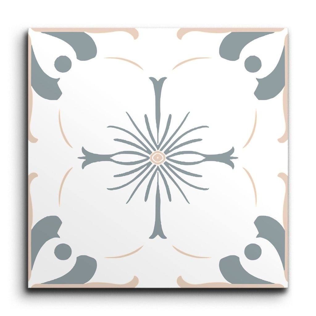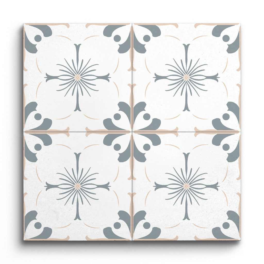 Deze decortegel toont een prachtig symmetrisch ontwerp, met een centraal bloemmotief omgeven door sierlijke krommen en abstracte vormen. Het patroon is geïnspireerd op klassieke encaustische tegels, bekend om hun ingewikkelde en decoratieve aantrekkingskracht. Een rustgevend palet van zachte grijze en beige tinten tegen een helder witte achtergrond verleent het stuk een subtiele elegantie. De mix van traditionele charme en eigentijdse flair maakt deze tegel tot een veelzijdige keuze voor verschillende decoratiestijlen.