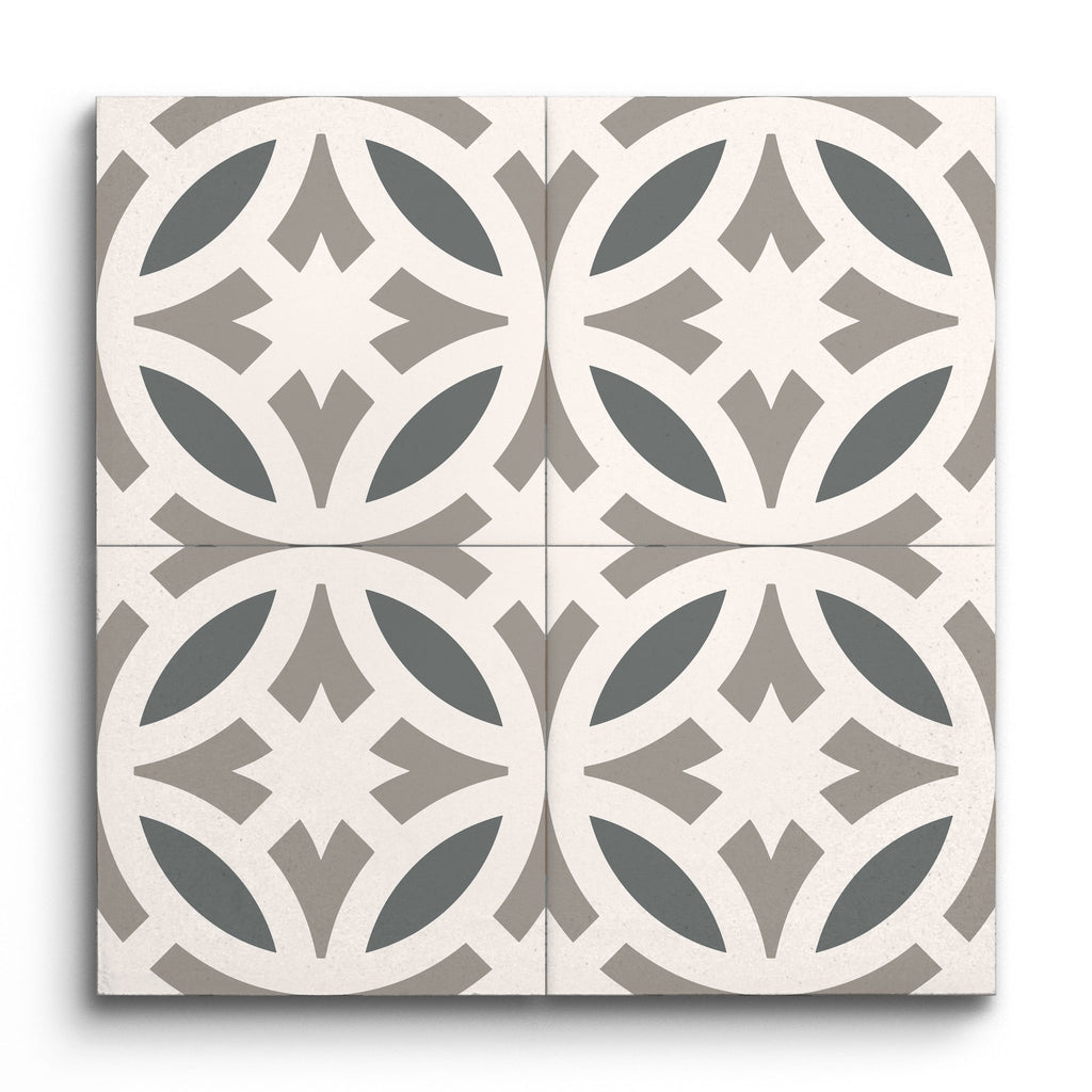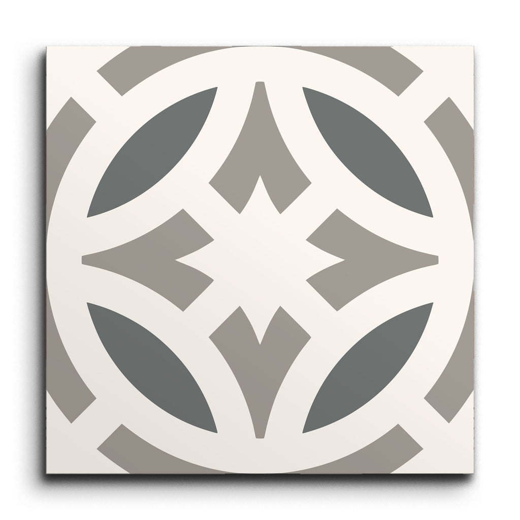 Deze decoratieve tegel toont een boeiend geometrisch patroon, met een harmonieuze mix van cirkel- en diamantvormen. Het ontwerp wordt gekenmerkt door zijn precieze symmetrie en strakke lijnen, waardoor er een ingewikkeld motief ontstaat dat de aandacht trekt. Een palet van grijs en wit zorgt voor een moderne en neutrale esthetiek, waardoor het een veelzijdige keuze is die naadloos kan integreren met diverse decoratiestijlen en tegelijkertijd een eigentijdse touch aan elke ruimte toevoegt.