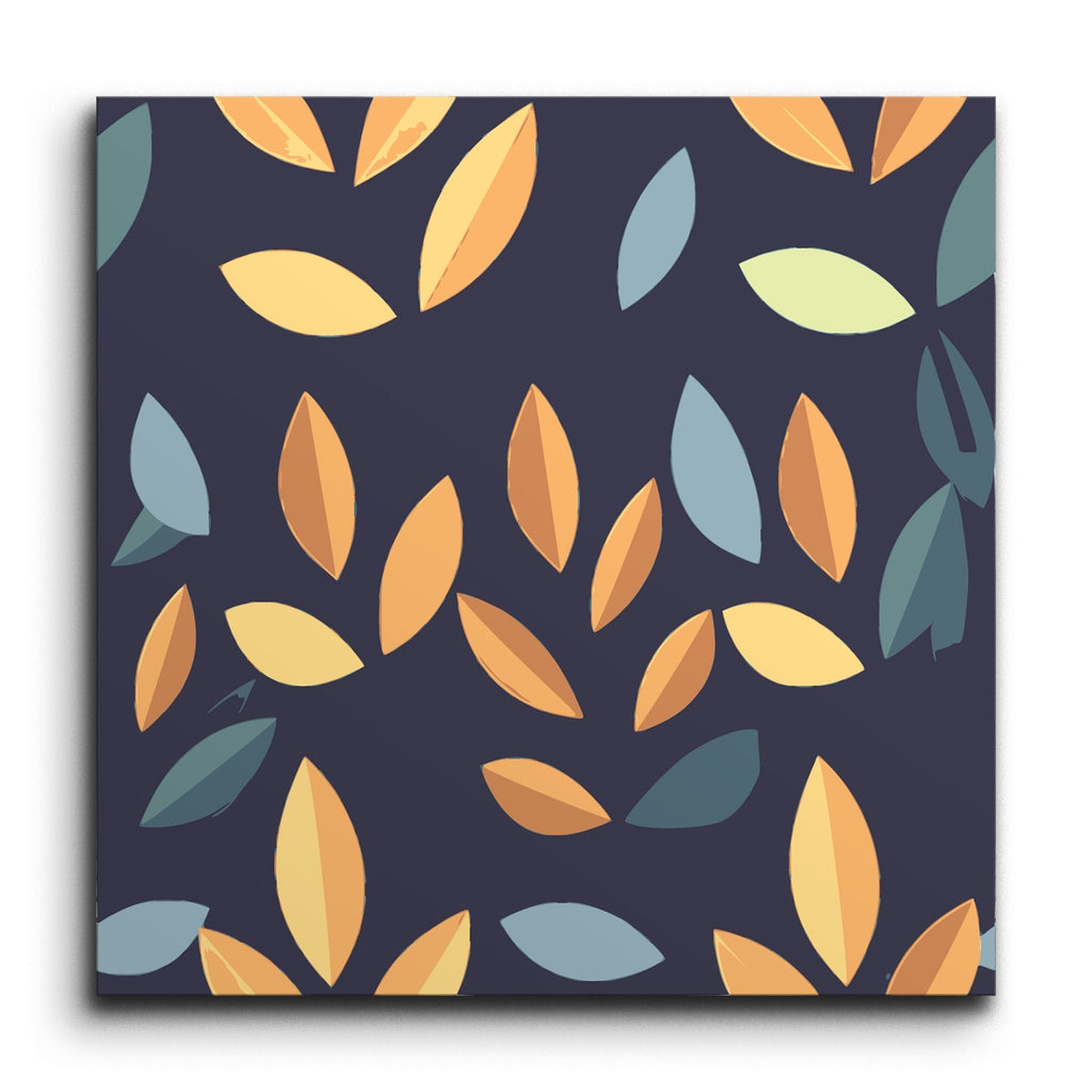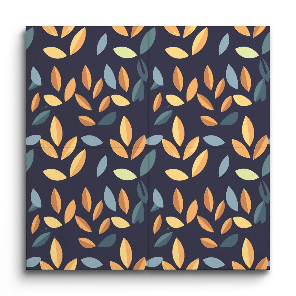Deze decortegel toont een dynamisch geometrisch patroon versierd met gestileerde bladvormen die over het oppervlak lijken te dansen. Het levendige kleurenpalet combineert tinten van oranje, geel, teal en lichtgroen, allemaal geplaatst tegen een diepblauwe achtergrond. Dit creëert een opvallend contrast dat het ontwerp tot leven brengt. Met zijn moderne en speelse maar gestructureerde esthetiek voegt deze tegel een levendige toets toe aan elke ruimte.