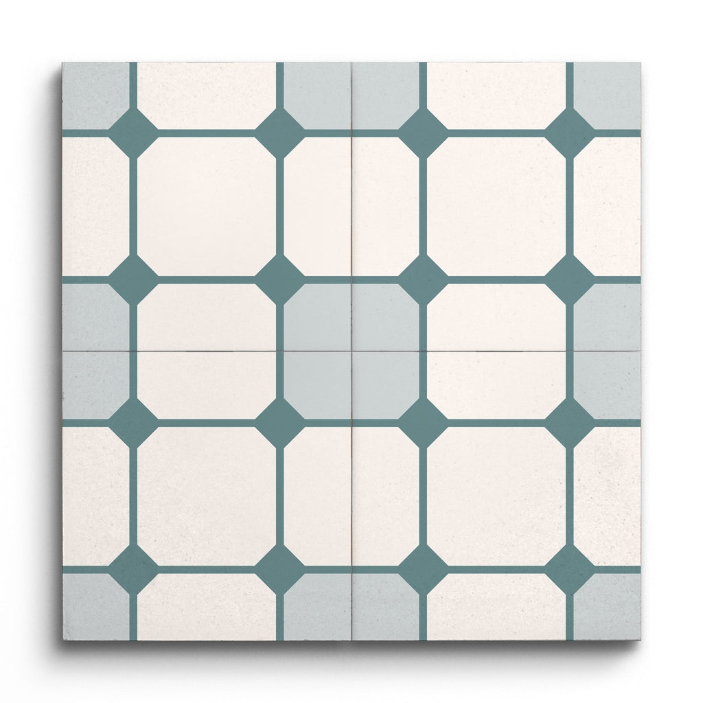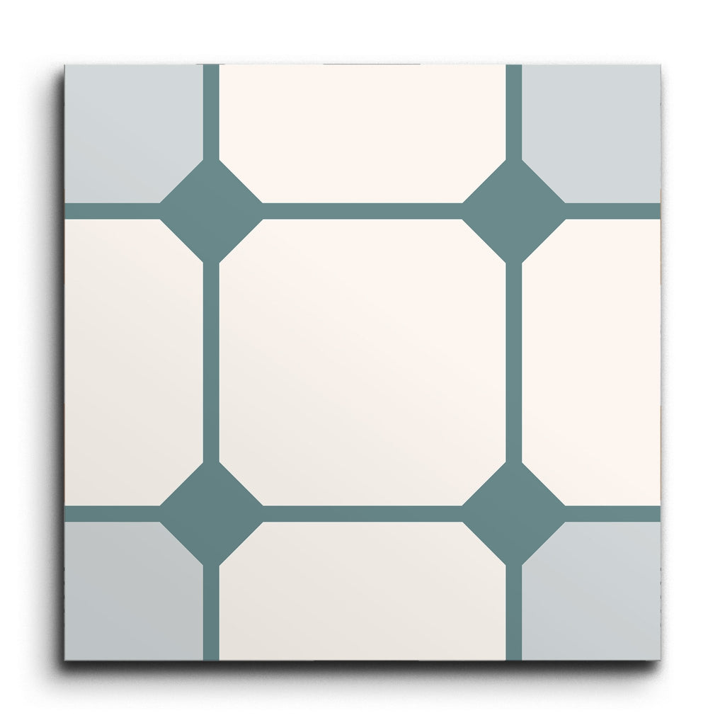Deze decoratieve tegel toont een verfijnd geometrisch patroon, met een harmonieuze mix van vierkanten en ruiten in een rasterachtige opstelling. Het palet van zacht grijs en wit biedt een rustgevende achtergrond, terwijl donkerder teal accenten diepte en definitie toevoegen aan de verbindingslijnen en ruitvormen. Het strakke, gestructureerde ontwerp brengt een vleugje moderne elegantie, waardoor het een veelzijdige keuze is voor elke eigentijdse ruimte.