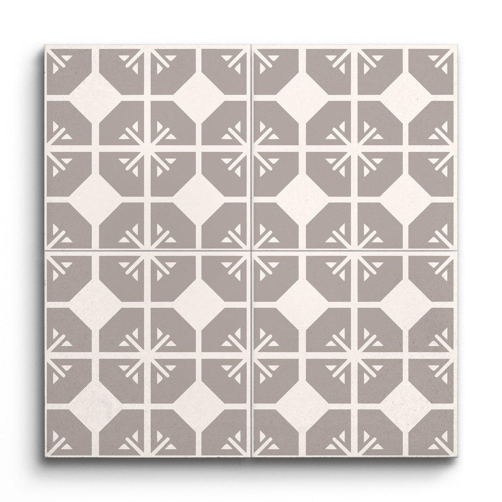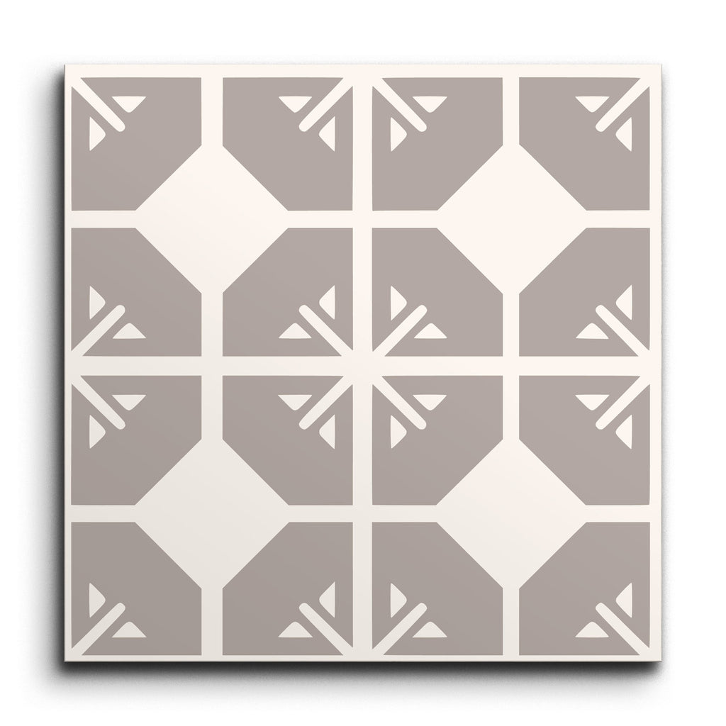 Deze decortegel toont een geometrisch ontwerp met herhalende diamantvormen, aangevuld met kleine driehoekige accenten. Het kleurenpalet van zacht taupe en gebroken wit biedt een subtiel maar opvallend contrast, waardoor de strakke lijnen en symmetrische rangschikking worden versterkt. Het resultaat is een moderne en minimalistische esthetiek die naadloos in een reeks interieurstijlen past.