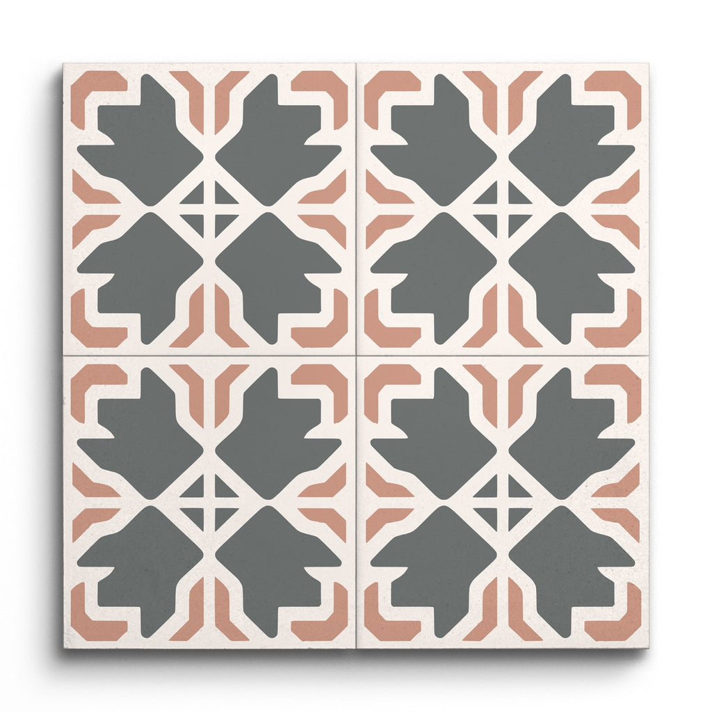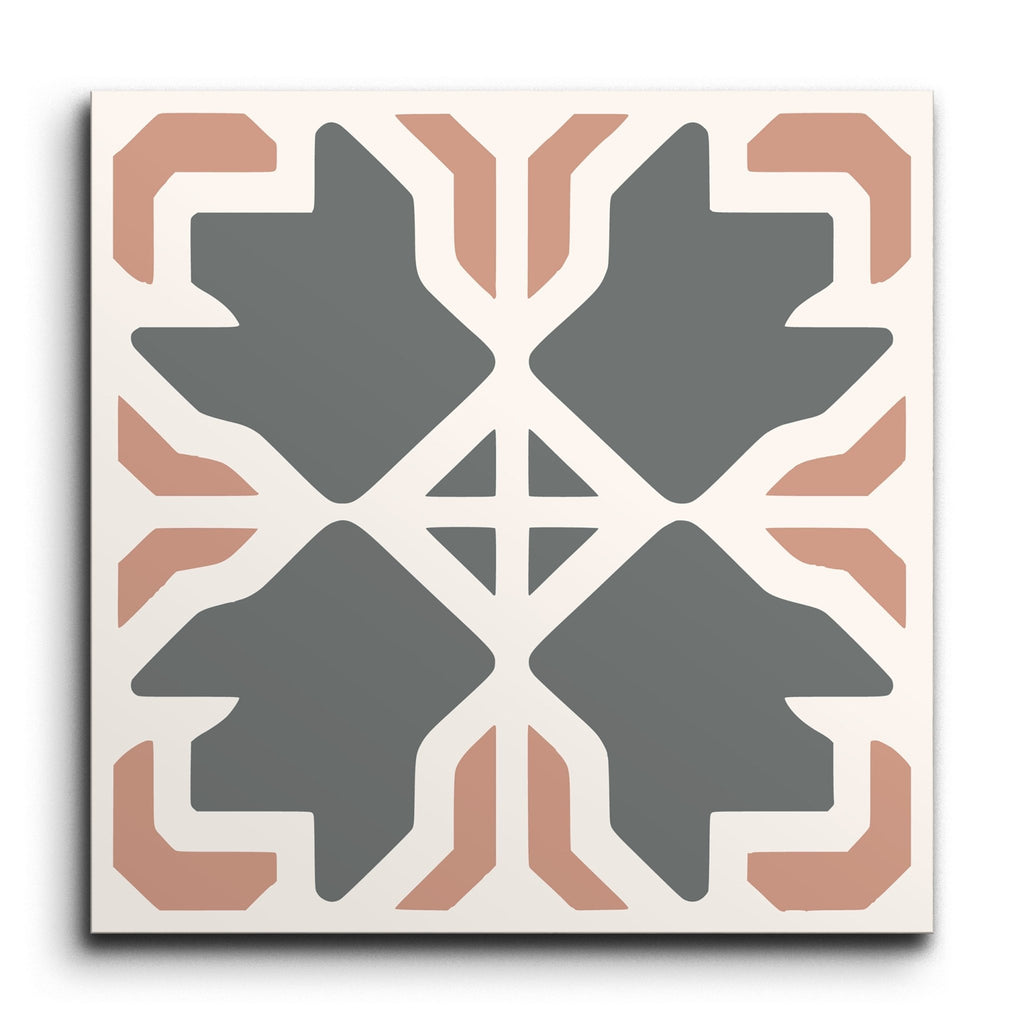 Deze decoratieve tegel toont een boeiend patroon geïnspireerd op encaustiek, met gedurfde geometrische vormen in een symmetrisch ontwerp. In het hart van de tegel roepen vier grote, donkergrijze vormen abstracte bloem- of bladmoten op. Deze centrale elementen worden prachtig aangevuld door kleinere, gebogen accenten in een warme terracottakleur, wat een opvallend contrast creëert. De zachte off-white achtergrond versterkt het samenspel van grijs en terracotta, wat resulteert in een visueel boeiende compositie. Het aardse en gedempte kleurenpalet geeft de tegel een tijdloze charme, waarbij klassieke elegantie wordt gecombineerd met een moderne touch.