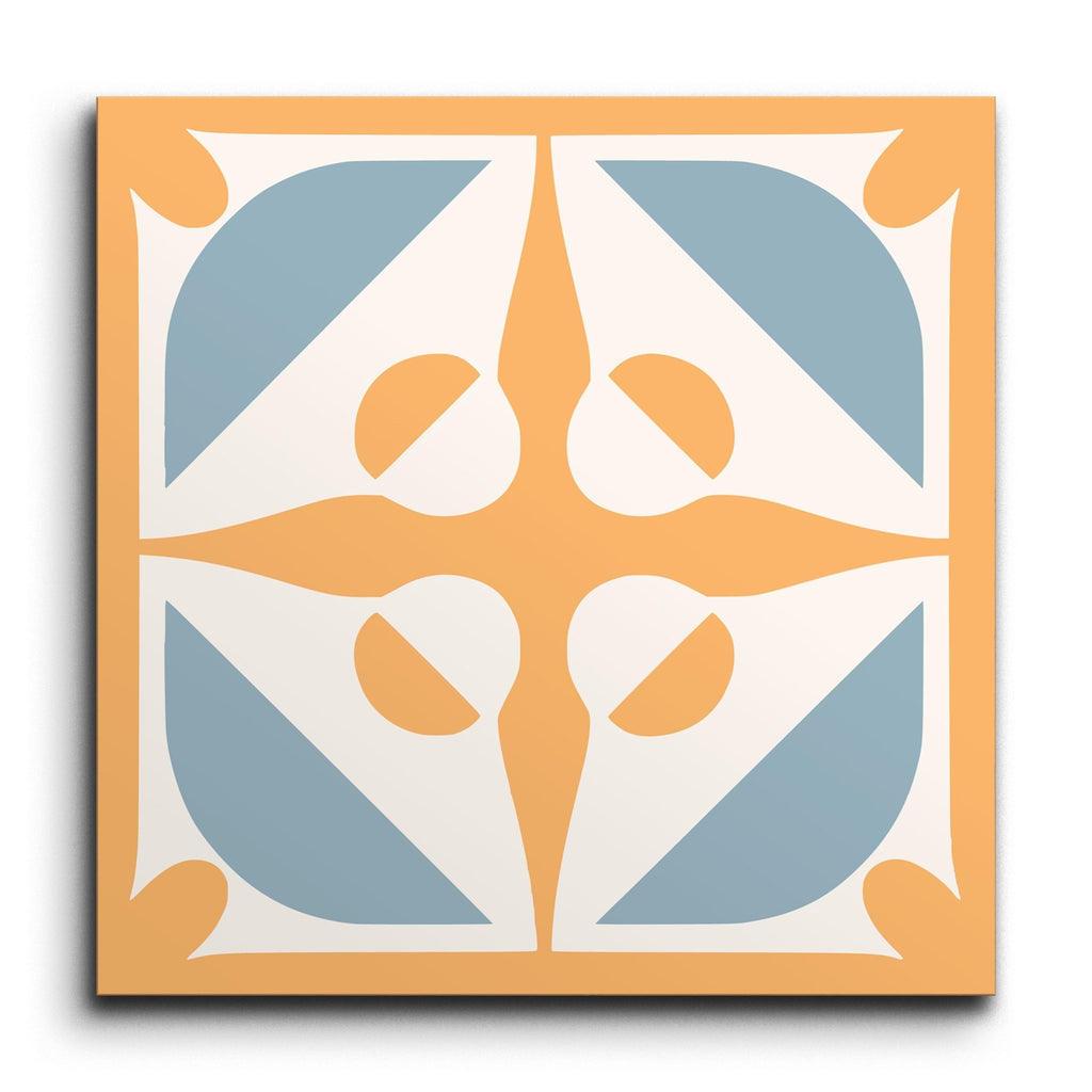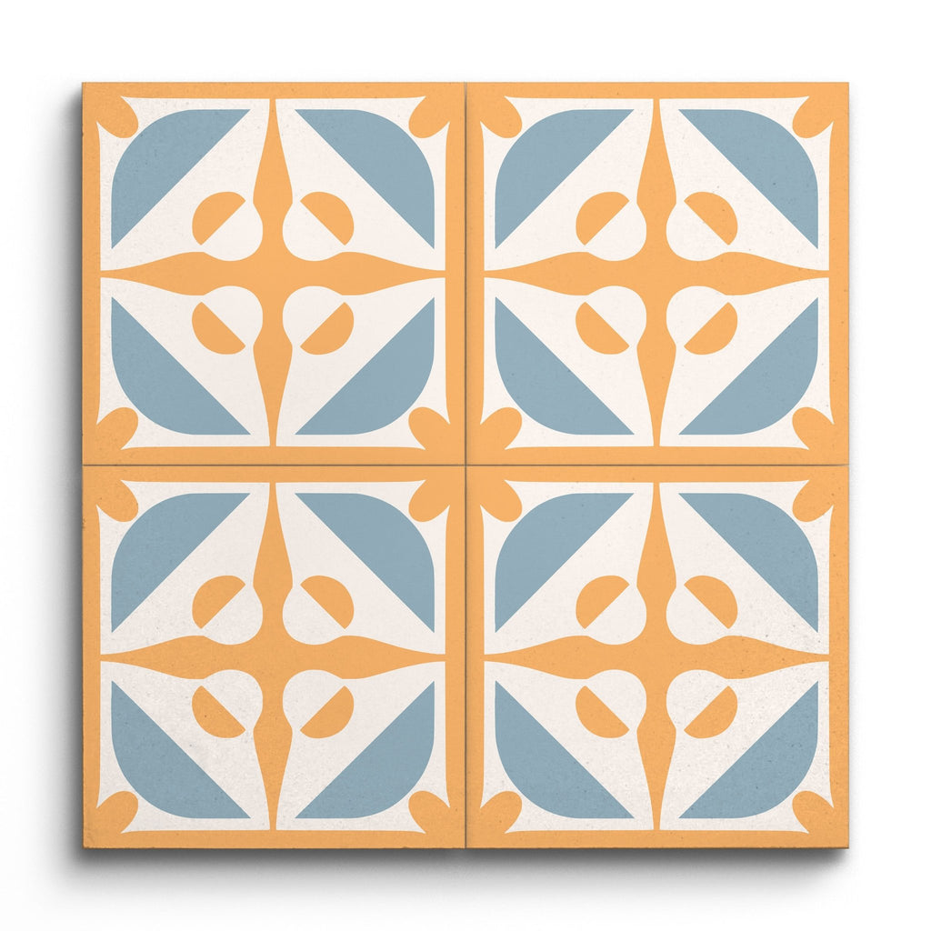 Deze decortegel toont een klassieke encaustische stijl, met een symmetrisch ontwerp dat een vintage charme uitstraalt. Het patroon bestaat uit geometrische vormen, waaronder elegante krommen en driehoeken, zorgvuldig gerangschikt om een harmonieuze visuele aantrekkingskracht te creëren. Het rustgevende kleurenpalet van zacht blauw en warm beige biedt een uitgebalanceerde en uitnodigende esthetiek. Het ingewikkelde maar toch strakke ontwerp voegt een retro-accent toe, waardoor het een charmante toevoeging is aan elke ruimte.