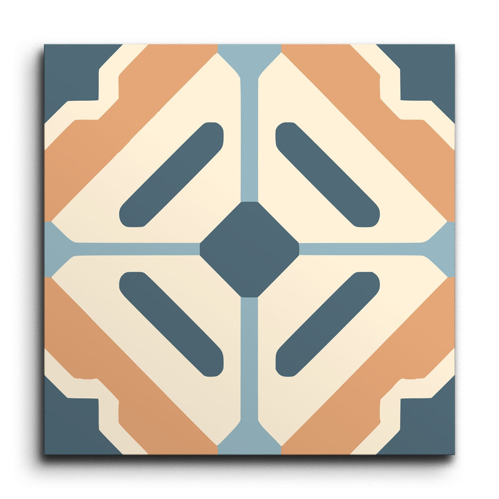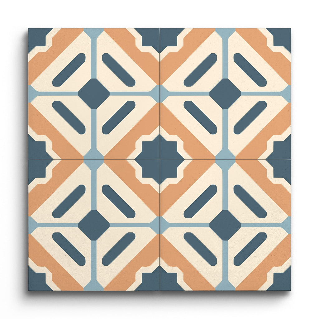 Deze decortegel toont een boeiend patroon in encaustische stijl met een centraal diamantmotief, omringd door gedurfde, hoekige lijnen die een harmonieus geometrisch ontwerp creëren. De gedempte tinten van blauw, beige en terracotta zorgen voor een warme, aardse sfeer en roepen een gevoel van klassieke charme op. De fusie van geometrische vormen en een rustgevend kleurenpalet slaat een brug tussen traditionele en eigentijdse esthetiek, waardoor het een veelzijdige keuze is voor elke ruimte.