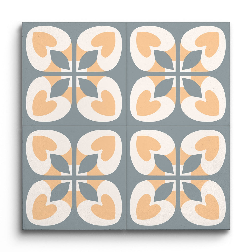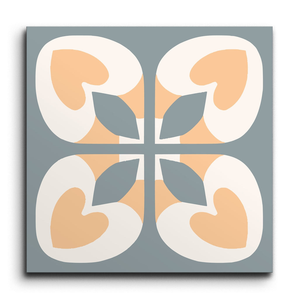 Deze decortegel toont een tijdloos encaustisch ontwerp, met een harmonieuze mix van geometrische en bloemmotieven. In het midden komen vier hartachtige vormen in een warme perzikkleur sierlijk samen, omringd door delicate bladachtige elementen in een gedempte teal tint. De zachte grijsblauwe achtergrond contrasteert subtiel met het ontwerp, waardoor de ingewikkelde details worden versterkt. Het gedempte kleurenpalet en het symmetrische patroon roepen een gevoel van balans en traditie op, waardoor het een perfecte aanvulling is voor elke ruimte die een vleugje klassieke elegantie zoekt.