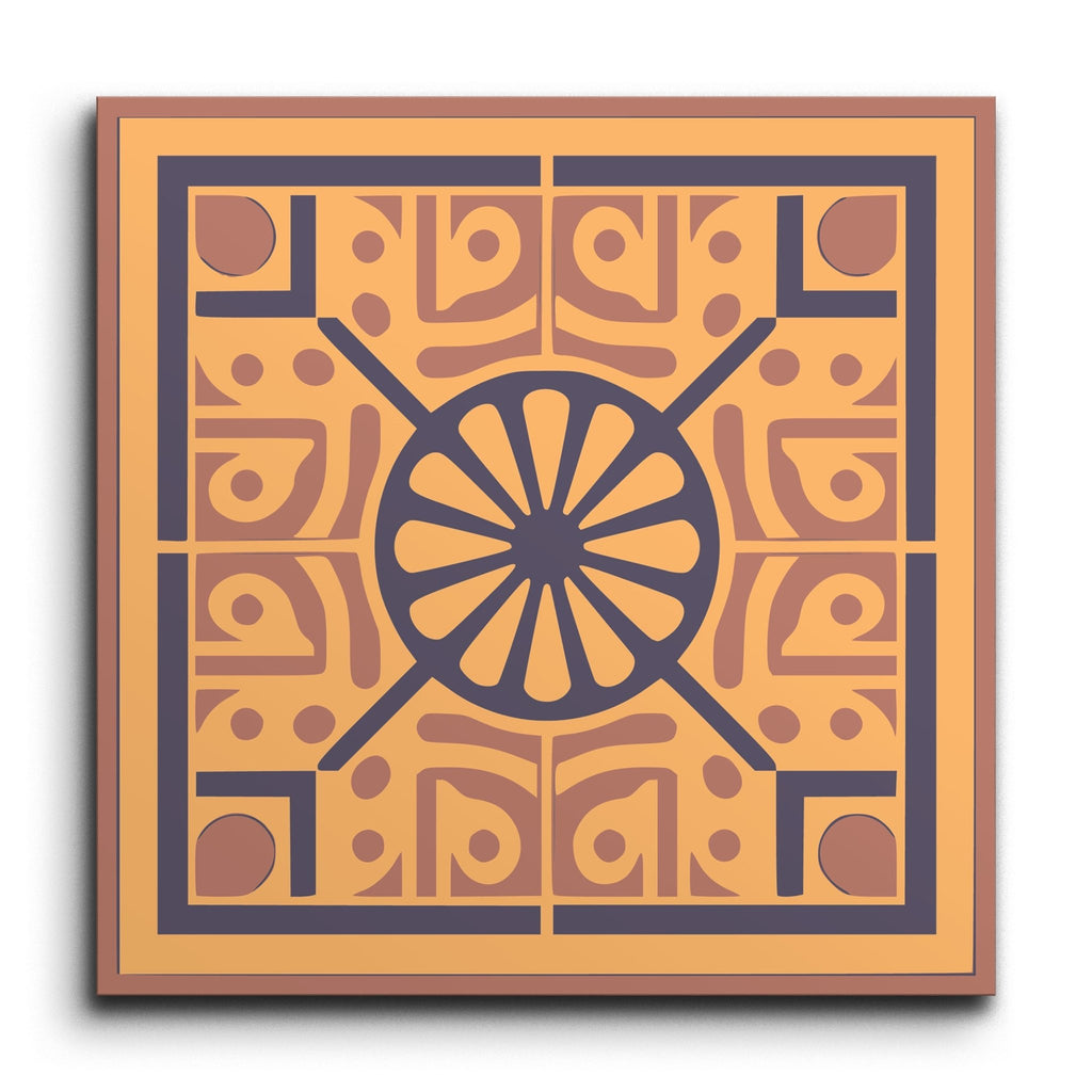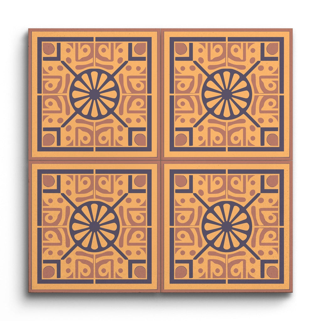 Deze decortegel toont een boeiend encaustisch patroon met een centraal cirkelmotief dat doet denken aan een bloem of zonnestraal. Rondom dit middelpunt bevinden zich geometrische vormen en abstracte figuren die samen een harmonieuze en ingewikkelde vormgeving creëren. Het kleurenpalet mengt warme oranje- en bruintinten met een diep blauwgrijs, wat resulteert in een klassieke maar levendige esthetiek. De decoratieve en sierlijke stijl van de tegel eert traditioneel vakmanschap, waardoor het een tijdloze toevoeging is aan elke ruimte.