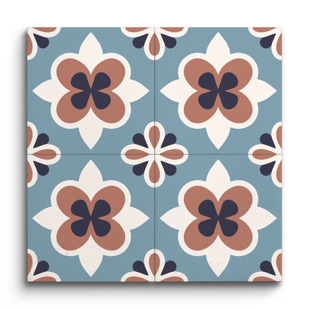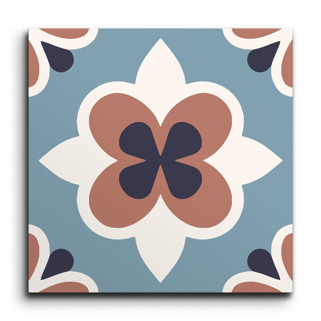 Deze decortegel toont een symmetrisch, bloemachtig ontwerp, benadrukt door een gedurfde geometrische vorm in het midden. De gedempte tinten blauw, bruin en crème komen samen om een harmonieuze en evenwichtige esthetiek te creëren. Geïnspireerd door traditionele encaustische tegels, biedt dit stuk een moderne draai met zijn eenvoud en zorgvuldig gekozen kleuren. De klassieke maar toch eigentijdse stijl maakt het een veelzijdige keuze voor verschillende decoromgevingen.