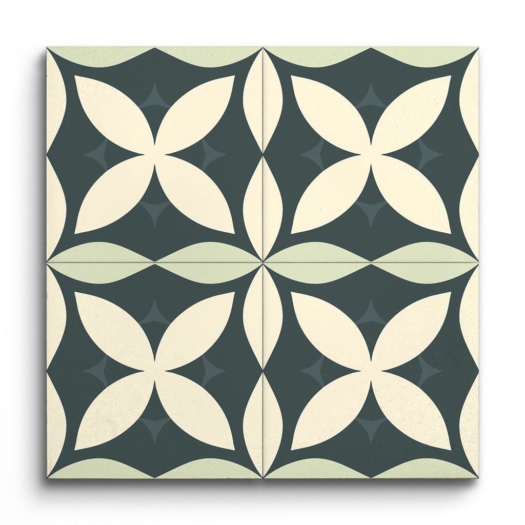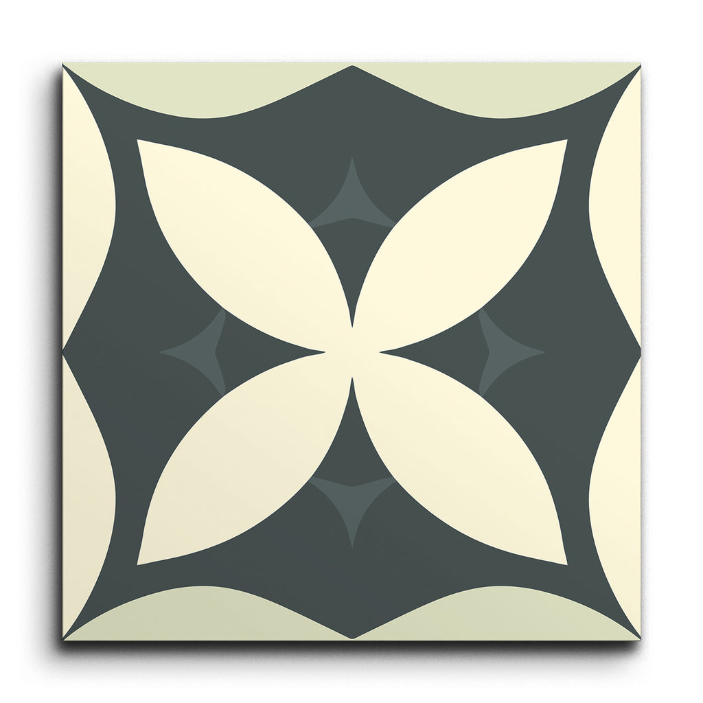 Deze Decoratie tegel toont een prachtig symmetrisch, geometrisch ontwerp, gecentreerd rond een ingewikkeld bloemmotief. Grote, bloembladachtige vormen in een zachte crèmekleur vormen de bloem, die levendig afsteekt tegen een diepe antracietgrijze achtergrond. Het scherpe contrast tussen de kleuren benadrukt het gedetailleerde en artistieke patroon, dat doet denken aan traditionele encaustische tegels. Deze combinatie van geometrische precisie en organische bloemelementen biedt een tijdloze charme, waardoor het perfect past in zowel moderne als vintage geïnspireerde interieurs. Of het nu als een blikvanger wordt gebruikt of als onderdeel van een groter ontwerp, deze tegel brengt een klassieke elegantie in elke ruimte.
