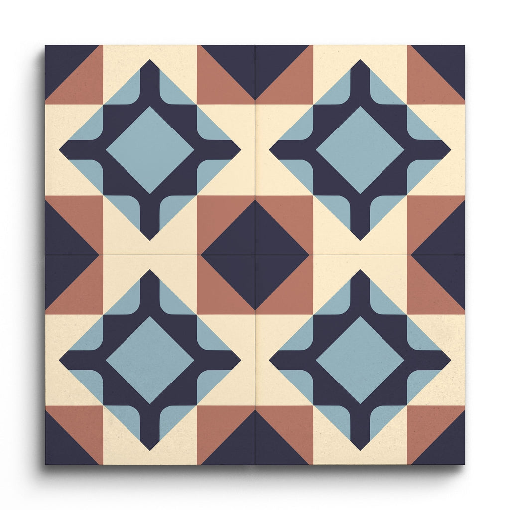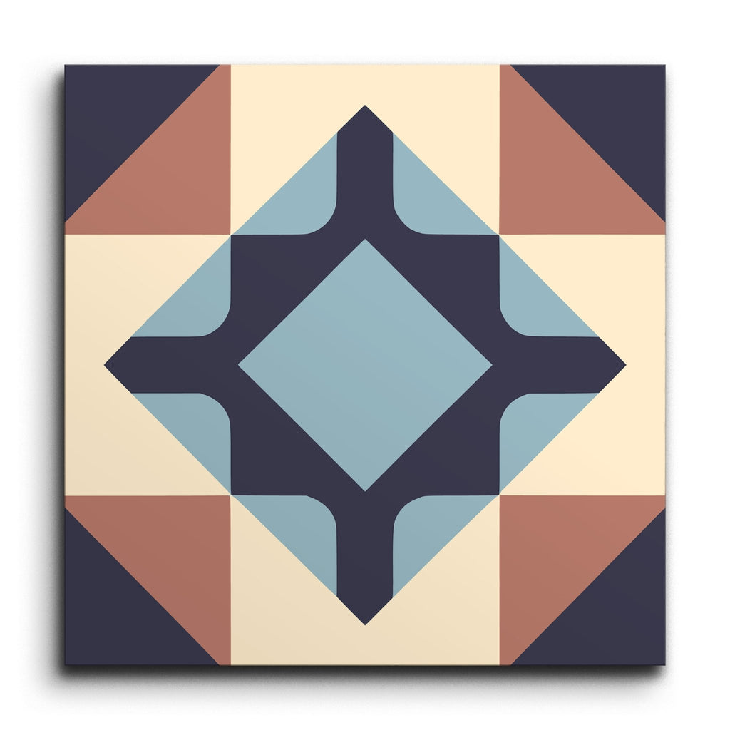 Deze decortegel toont een boeiend geometrisch patroon gecentreerd rond een diamantvorm, naadloos omringd door ineengrijpende vormen die symmetrie en balans uitstralen. Het ontwerp komt tot leven met een ingetogen palet van blauw, beige en terracotta, wat een moderne maar tijdloze aantrekkingskracht biedt. De contrasterende kleuren en strakke lijnen benadrukken de geometrische elementen, waardoor een visueel opvallend stuk ontstaat dat perfect is voor eigentijdse ruimtes.