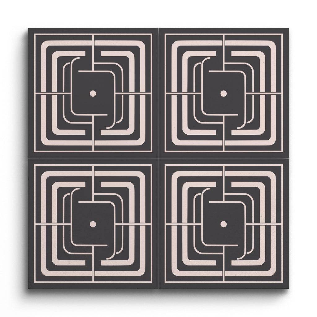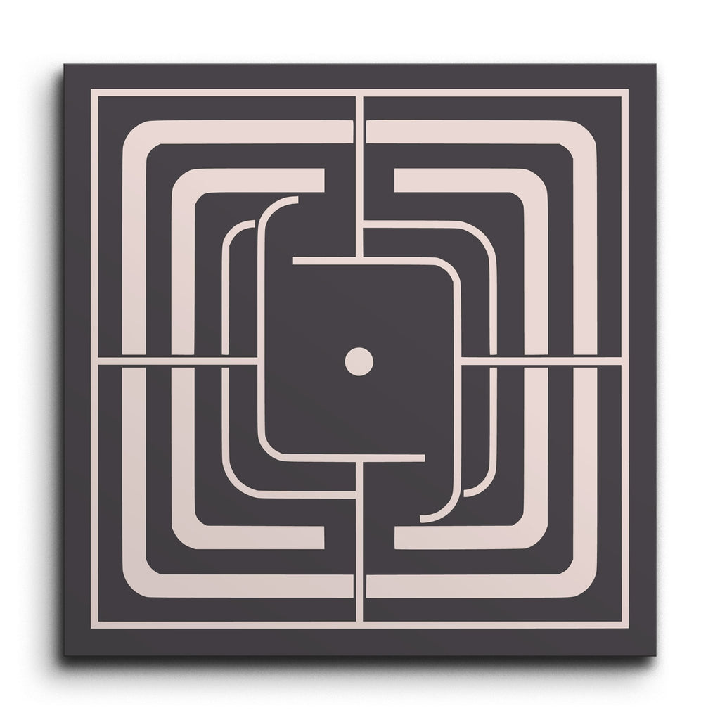 Deze decortegel toont een boeiend geometrisch patroon bestaande uit concentrische rechthoeken en krommen, die een harmonieuze en symmetrische vormgeving vormen. Het samenspel van donkergrijs en lichtbeige creëert een opvallend contrast, wat een strakke en eigentijdse uitstraling aan het stuk geeft. Een centrale stip dient als focuspunt, subtiel de visuele aantrekkingskracht van het patroon versterkend. Perfect om een moderne touch aan elke ruimte toe te voegen, combineert deze tegel precisie en stijl in een naadloze mix.