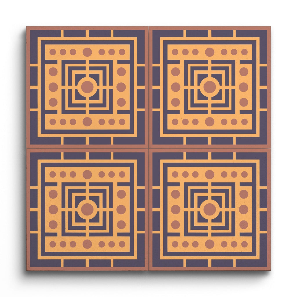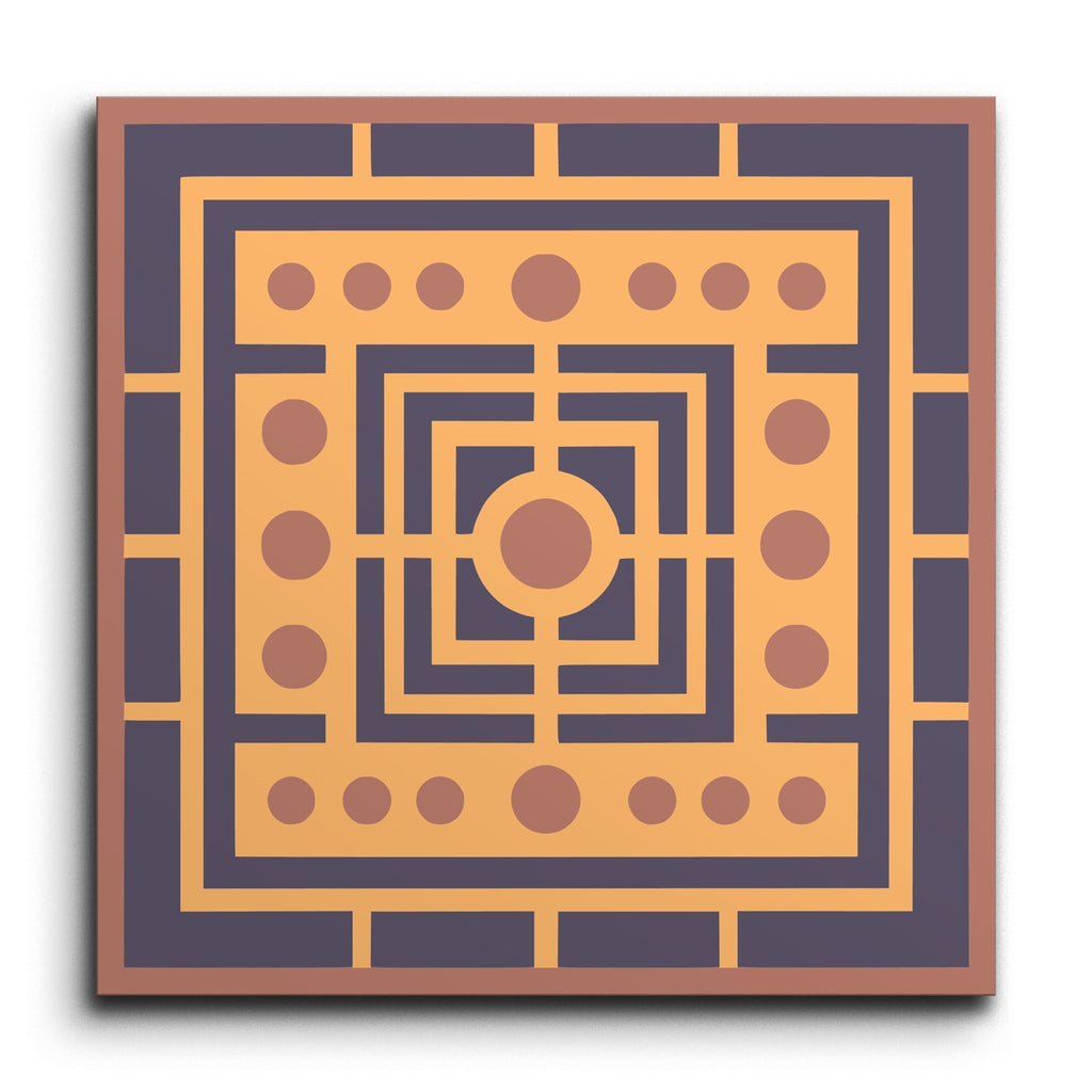 Deze decoratieve tegel toont een boeiend geometrisch ontwerp, met concentrische vierkanten en cirkels die een harmonieuze mix van symmetrie en balans in elke ruimte brengen. De warme tinten bruin en gedempt oranje creëren een uitnodigende, aardse sfeer. De herhalende vormen en lijnen benadrukken de gestructureerde elegantie die typerend is voor geometrische stijlen, en voegen een vleugje verfijning toe aan uw decor.