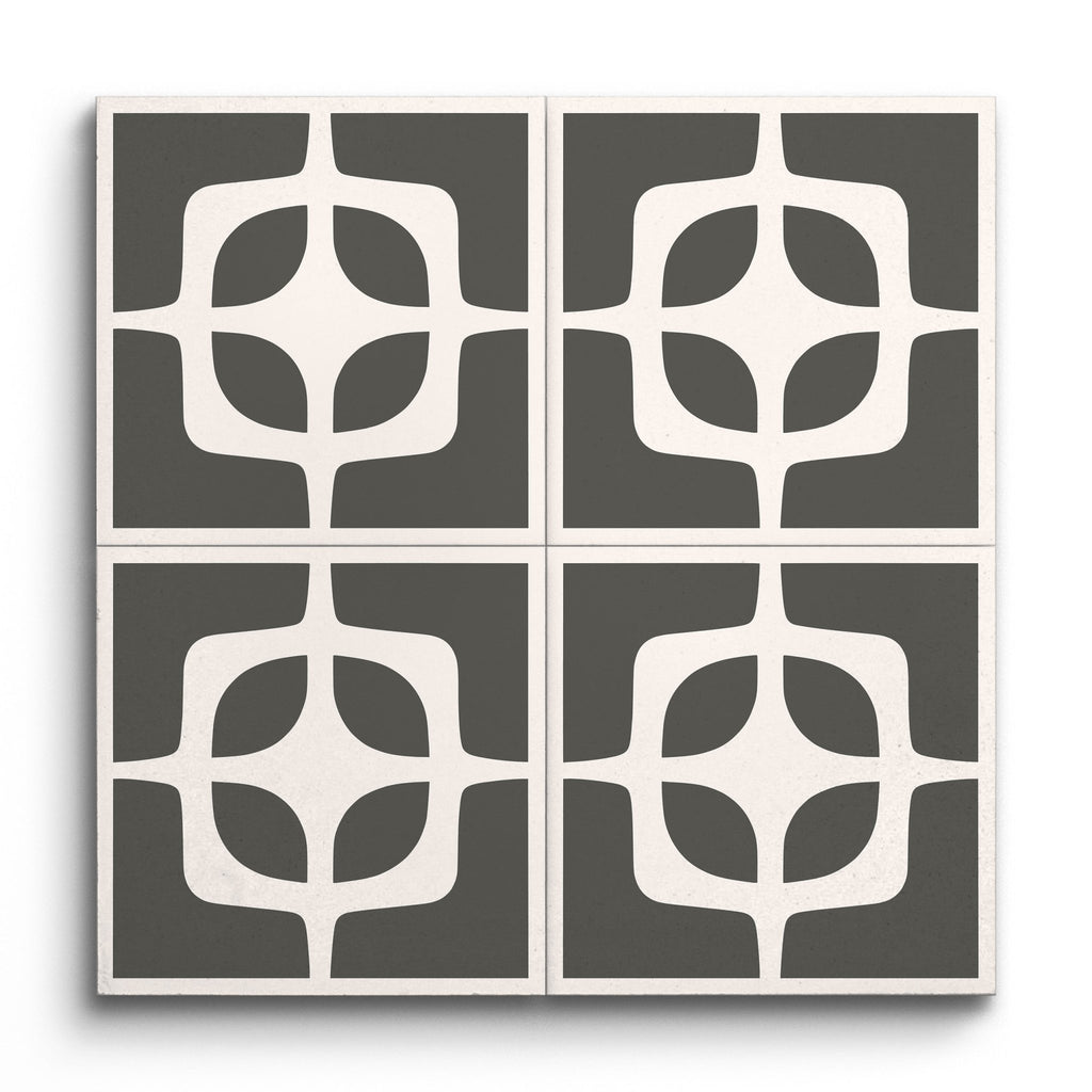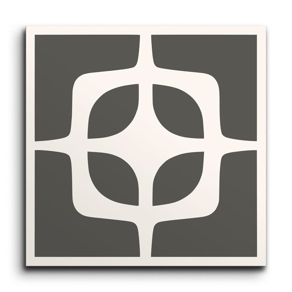Deze decoratieve tegel toont een opvallend geometrisch patroon met een symmetrische rangschikking van in elkaar grijpende vormen. Het donkergrijze en witte kleurenschema creëert een gedurfde contrast, waardoor het moderne, minimalistische ontwerp wordt benadrukt. De strakke lijnen en eenvoud geven een eigentijdse uitstraling, waardoor het een ideale keuze is voor verschillende interieurontwerpen.