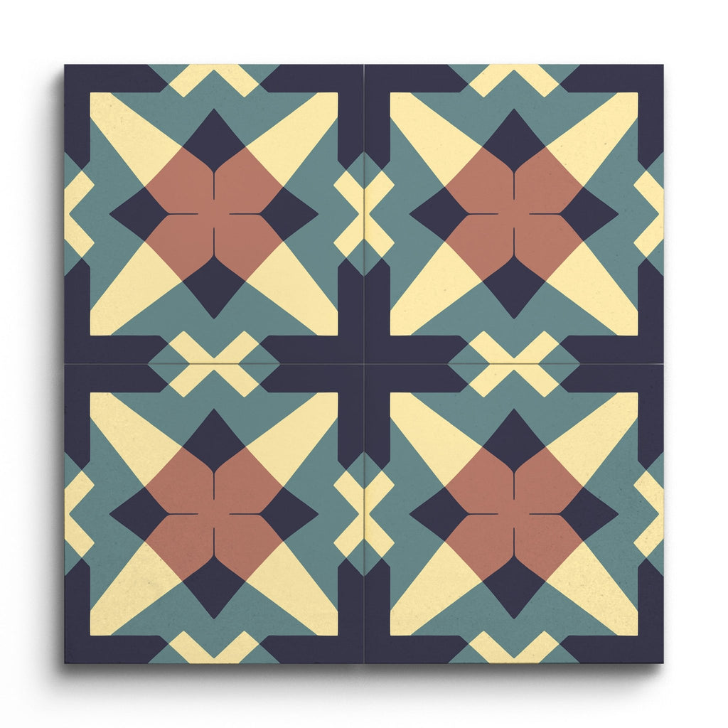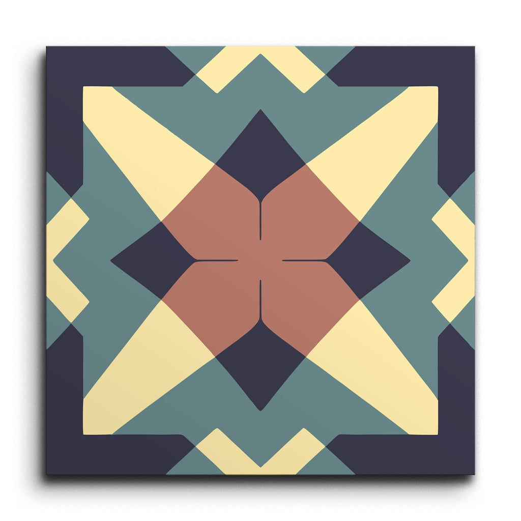 Deze decortegel toont een boeiend geometrisch patroon met in elkaar grijpende driehoeken en diamantvormen die samenkomen in een centraal stermotief. Het kleurenpalet combineert op harmonieuze wijze gedempte tinten van marineblauw, saliegroen, crème en warm terracotta, wat een gebalanceerd maar dynamisch uiterlijk creëert. Het gestructureerde ontwerp en de contrasterende kleuren werken samen om de visuele aantrekkingskracht te versterken, waardoor het een opvallend stuk is voor elke omgeving.