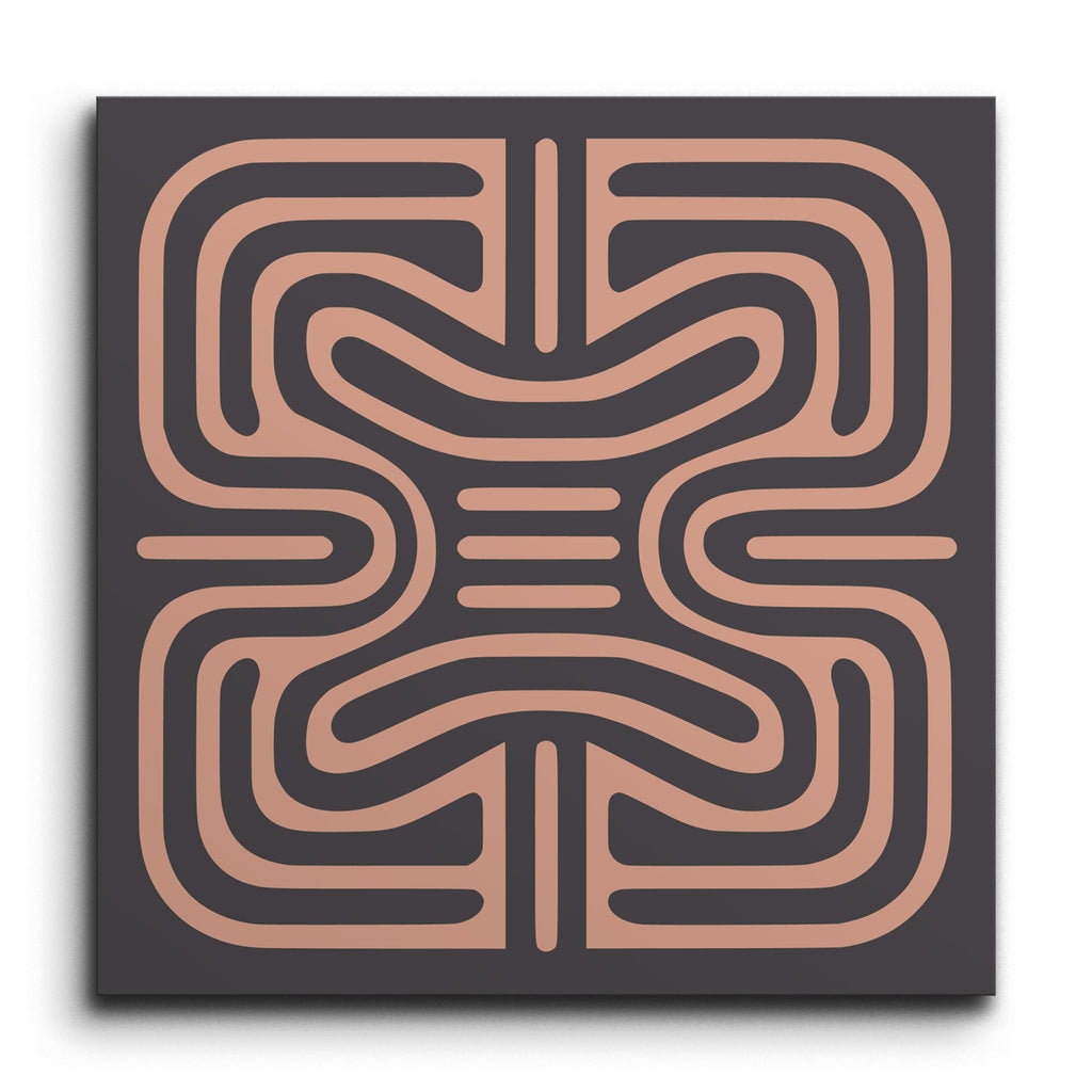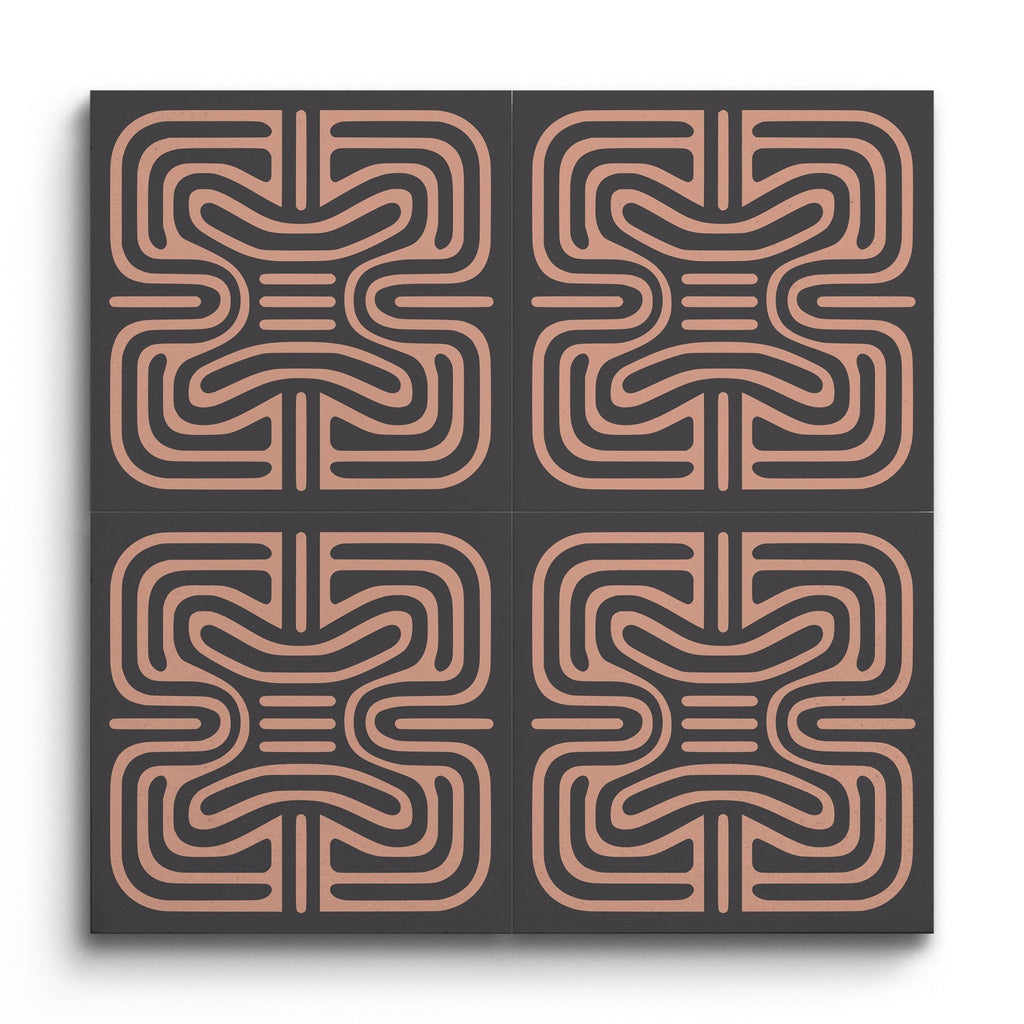 Deze decortegel toont een boeiend geometrisch patroon met elegant gebogen lijnen die een doolhofachtige structuur vormen. De rijke koper- of terracottatinten contrasteren prachtig tegen een diepe houtskoolachtergrond, wat een visueel opvallend effect creëert. Het moderne ontwerp, met zijn strakke lijnen en repetitief motief, voegt een gedurfde en eigentijdse toets toe aan elke ruimte, waardoor het een veelzijdige keuze is voor interieurs die geometrische en abstracte esthetiek omarmen.