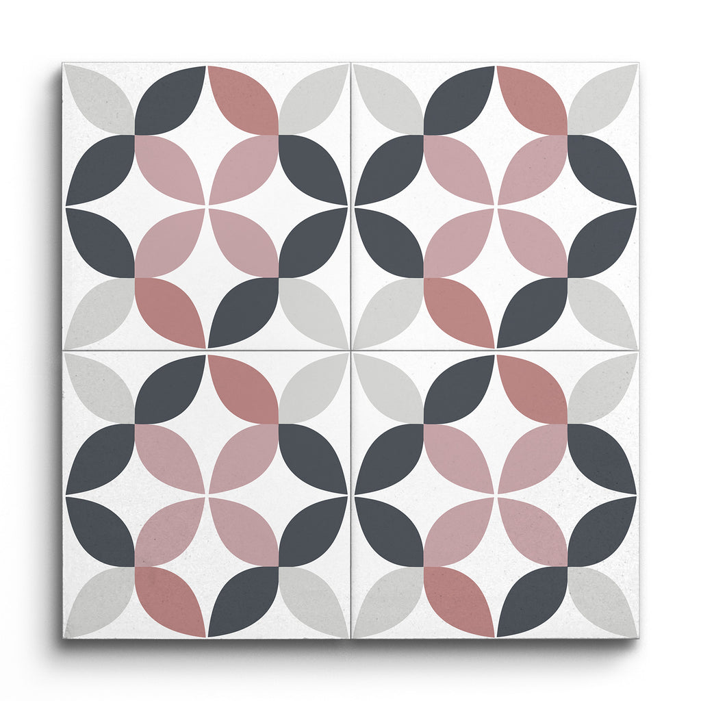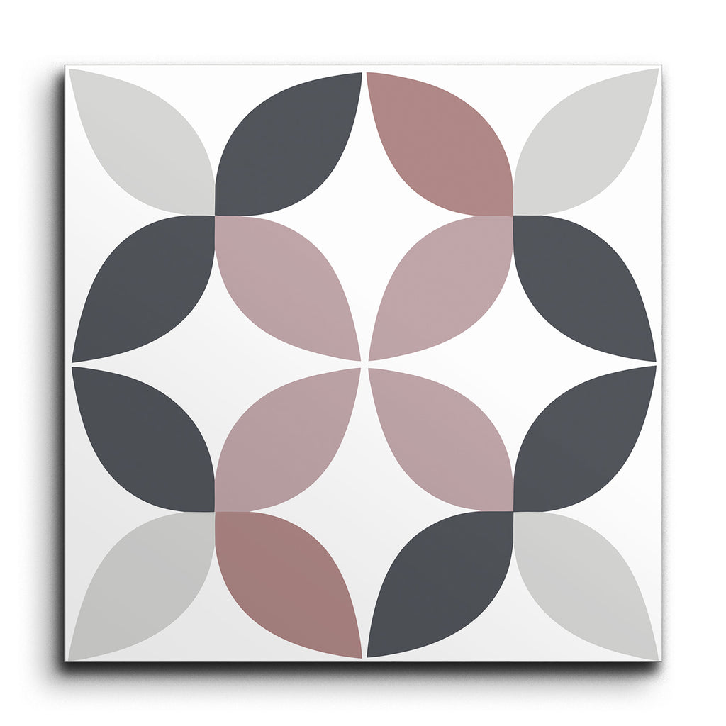 Deze Decoratie tegel toont een fascinerend geometrisch ontwerp, waarbij bloembladachtige vormen in elkaar grijpen om een elegante cirkelvormige motief te vormen. Het palet is een verfijnde mix van donkergrijs, lichtgrijs en stofroze, wat zorgt voor een gedempte maar toch verfijnde uitstraling. Het symmetrische en herhalende patroon brengt een gevoel van balans en harmonie in elke ruimte. Met zijn moderne en minimalistische stijl, met strakke lijnen en een subtiele kleurencombinatie, benadrukt deze tegel moeiteloos de schoonheid van geometrische vormen.
