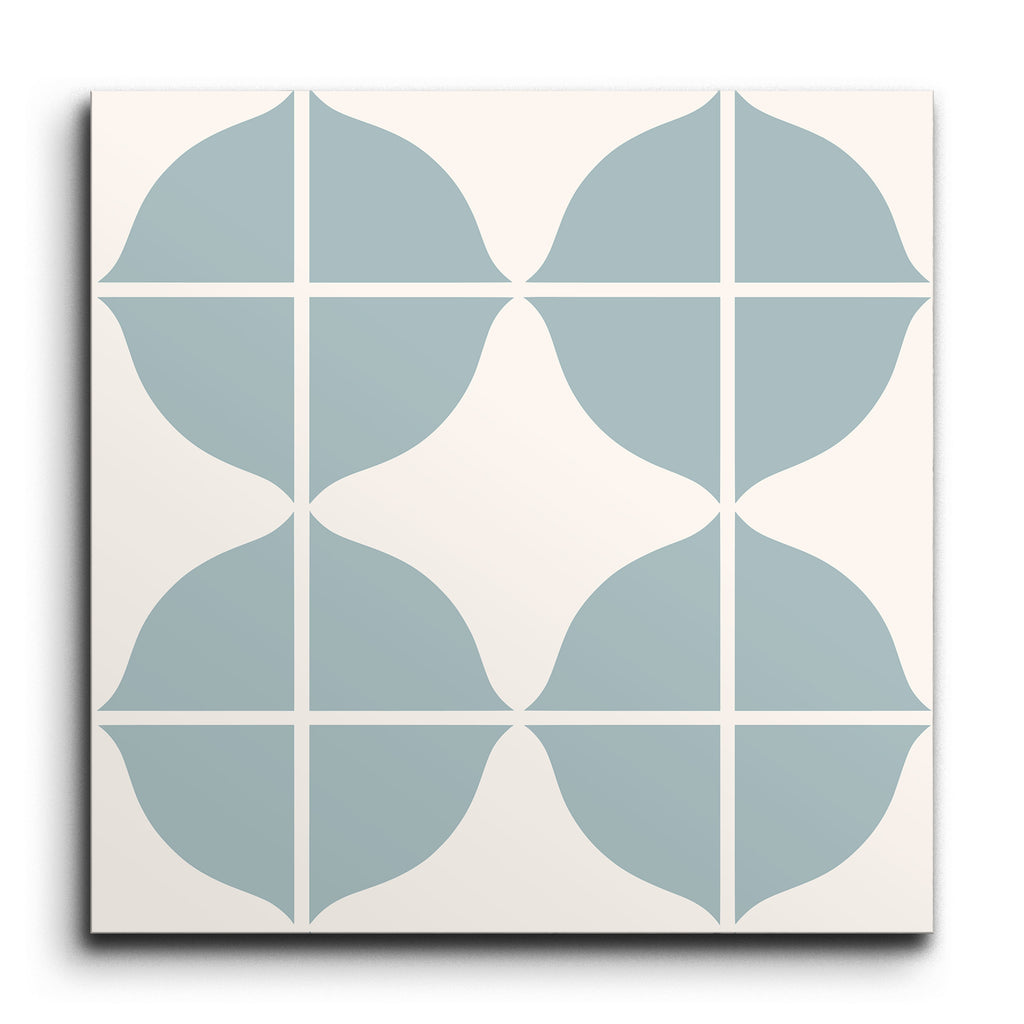 Deze decortegel toont een geometrisch ontwerp bestaande uit symmetrische vormen die lijken op gestileerde bladeren of bloemblaadjes. Het patroon is gerangschikt in een rasterachtige formatie, wat een gevoel van herhaling en harmonie biedt. De zachte blauwe tinten tegen een helderwitte achtergrond creëren een strakke en moderne uitstraling. De eenvoud en symmetrie van het ontwerp dragen bij aan de eigentijdse aantrekkingskracht, terwijl de geometrische elementen naadloos aansluiten bij een minimalistische esthetiek.
