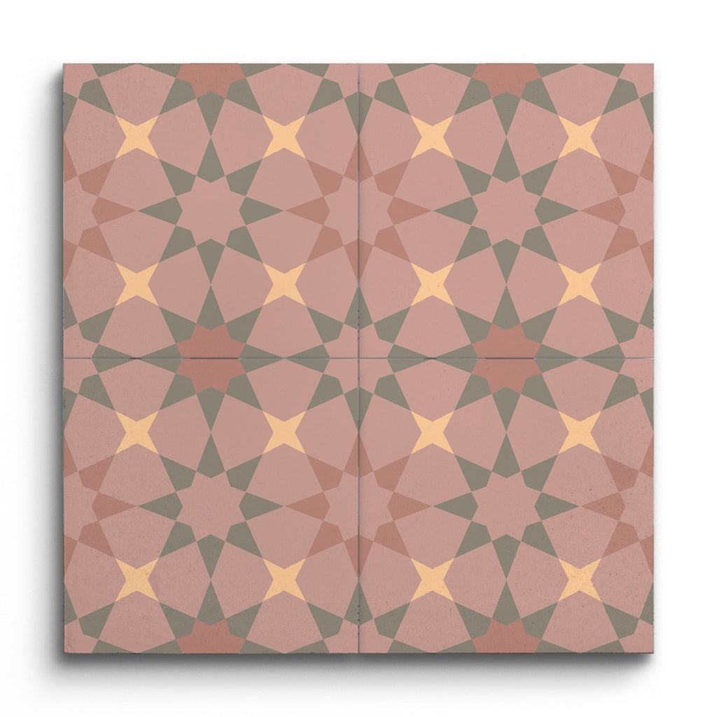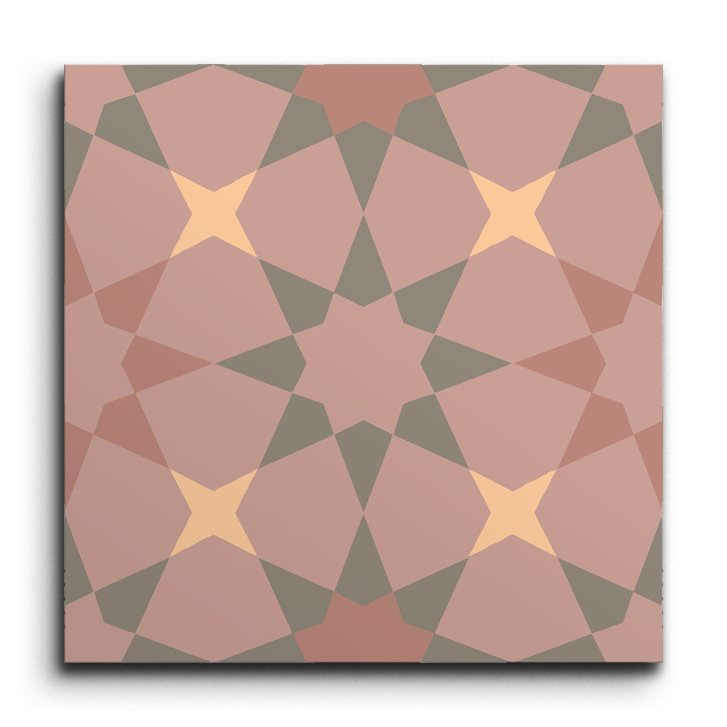Deze decortegel toont een boeiend geometrisch patroon met overlappende vormen die een symmetrisch motief vormen. De harmonieuze mix van roze, perzik en gedempte groentinten creëert een warme en uitnodigende esthetiek. De hoekige vormen en gestructureerde lijnen geven een moderne uitstraling, waardoor deze tegel perfect past in eigentijdse ruimtes die op zoek zijn naar een visueel aantrekkelijk element.
