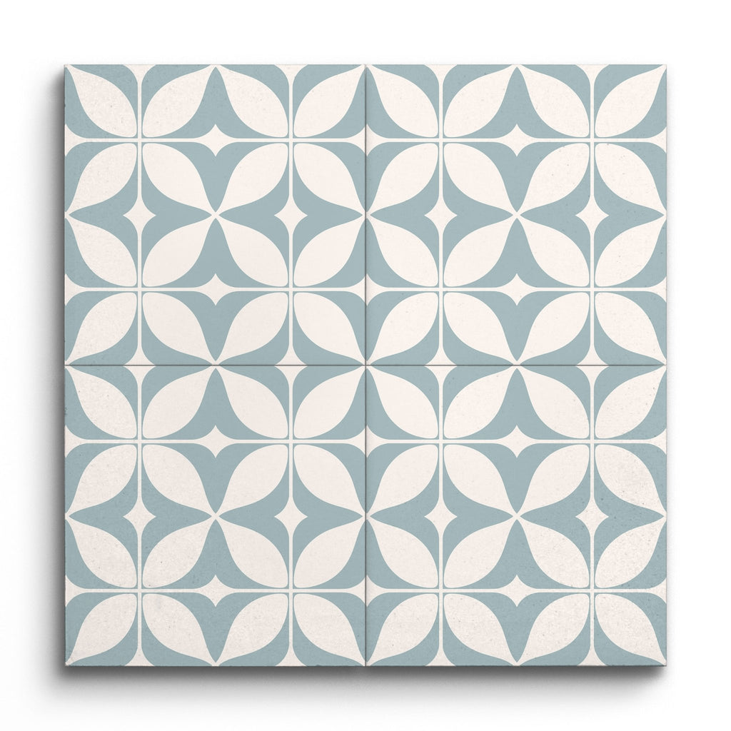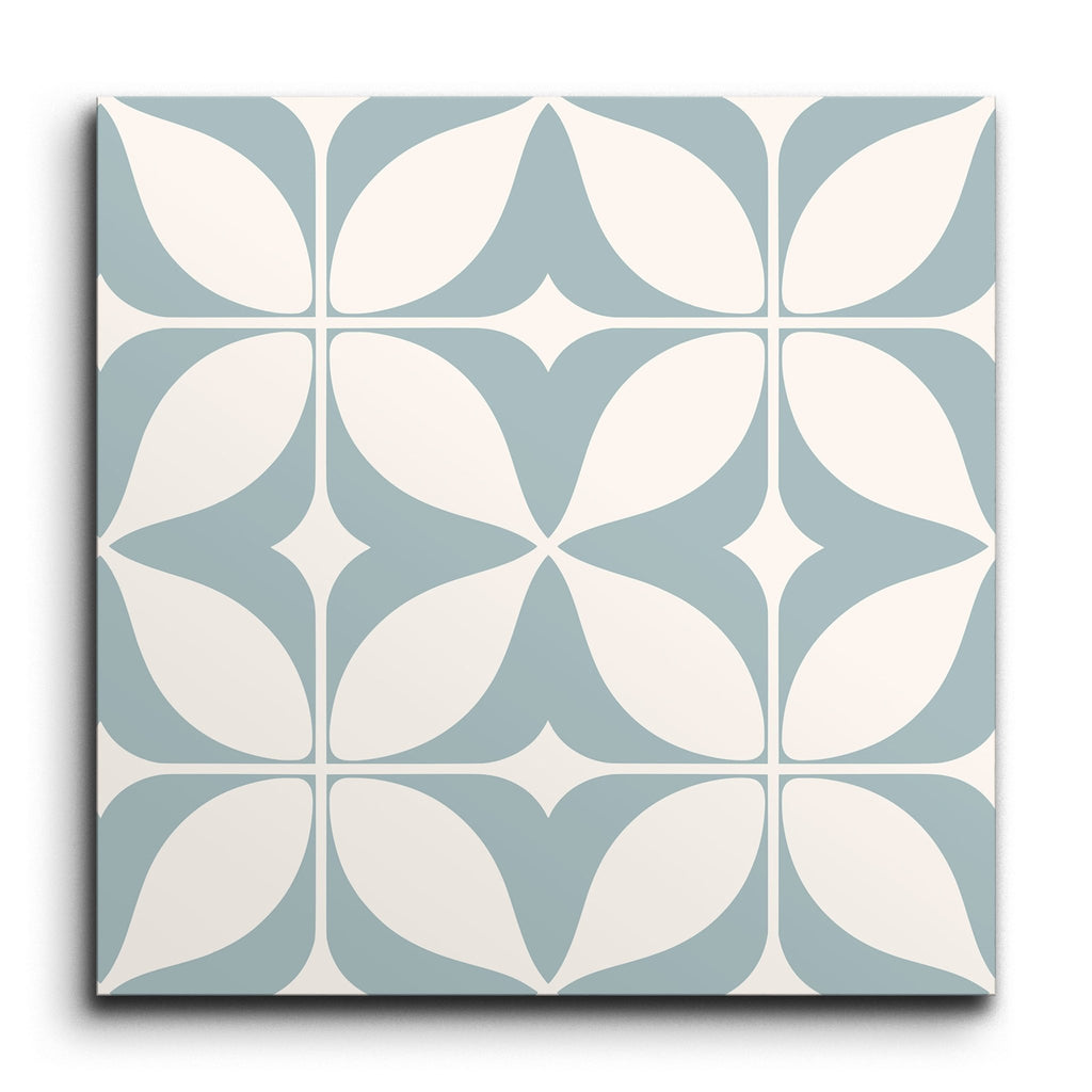 Deze decoratieve tegel toont een symmetrisch geometrisch patroon met zich herhalende vormen die doen denken aan gestileerde bladeren of bloemblaadjes. Geordend in een raster biedt het ontwerp een gevoel van harmonie en balans. Het zachte blauw-grijze en witte kleurenpalet straalt een kalme en moderne sfeer uit, terwijl de strakke lijnen en organische vormen een vleugje subtiele elegantie introduceren. Perfect om een eigentijds maar verfijnd element aan elke ruimte toe te voegen.