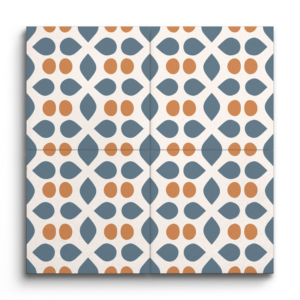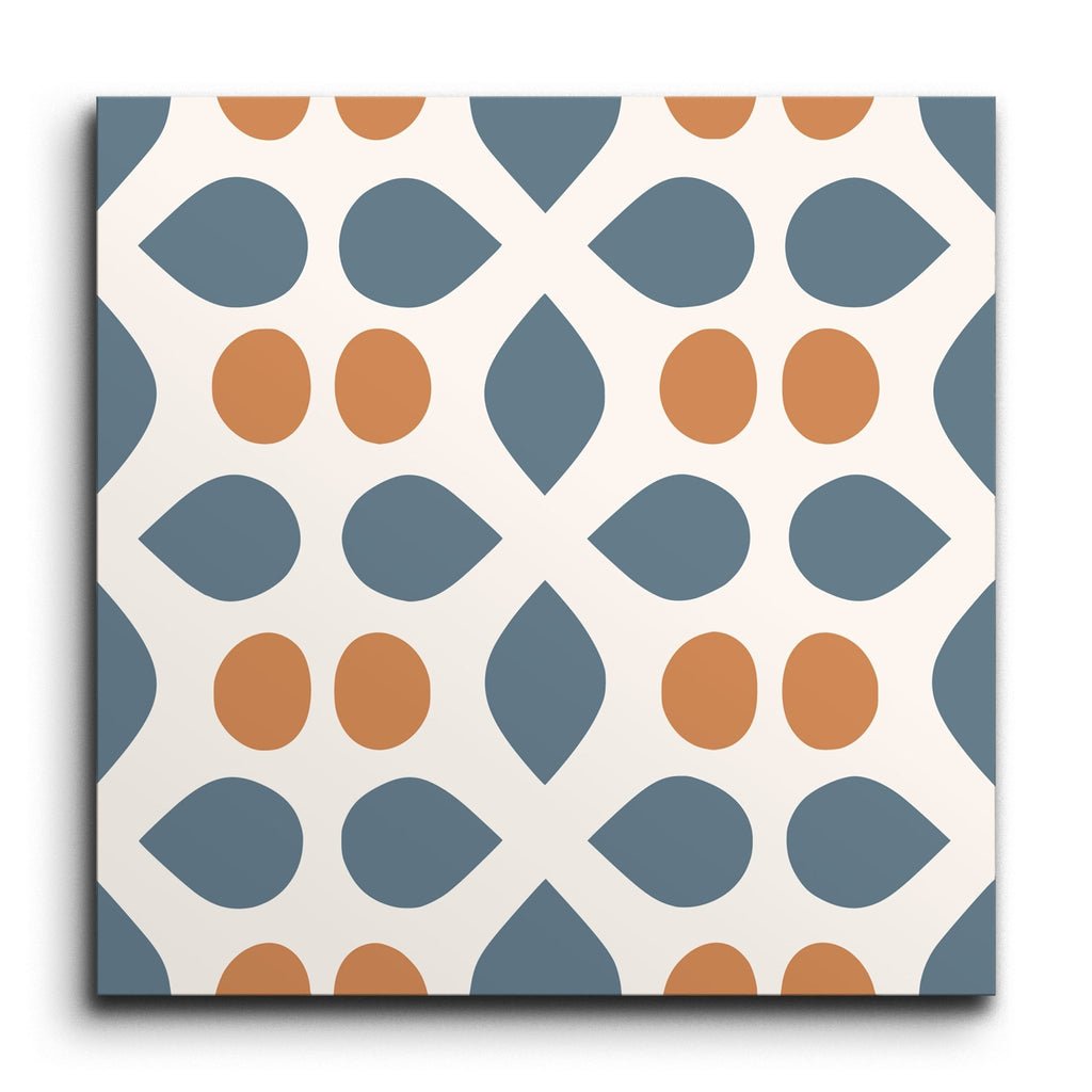 Deze decortegel toont een geometrisch ontwerp met een harmonieuze mix van bladvormige vormen en cirkels. De gedempte blauwe en warme terracottatinten tegen een crèmekleurige achtergrond creëren een uitgebalanceerd en uitnodigend palet. Het symmetrische en eenvoudige patroon voegt een vleugje moderne elegantie toe, perfect voor degenen die houden van een strakke en eigentijdse esthetiek.