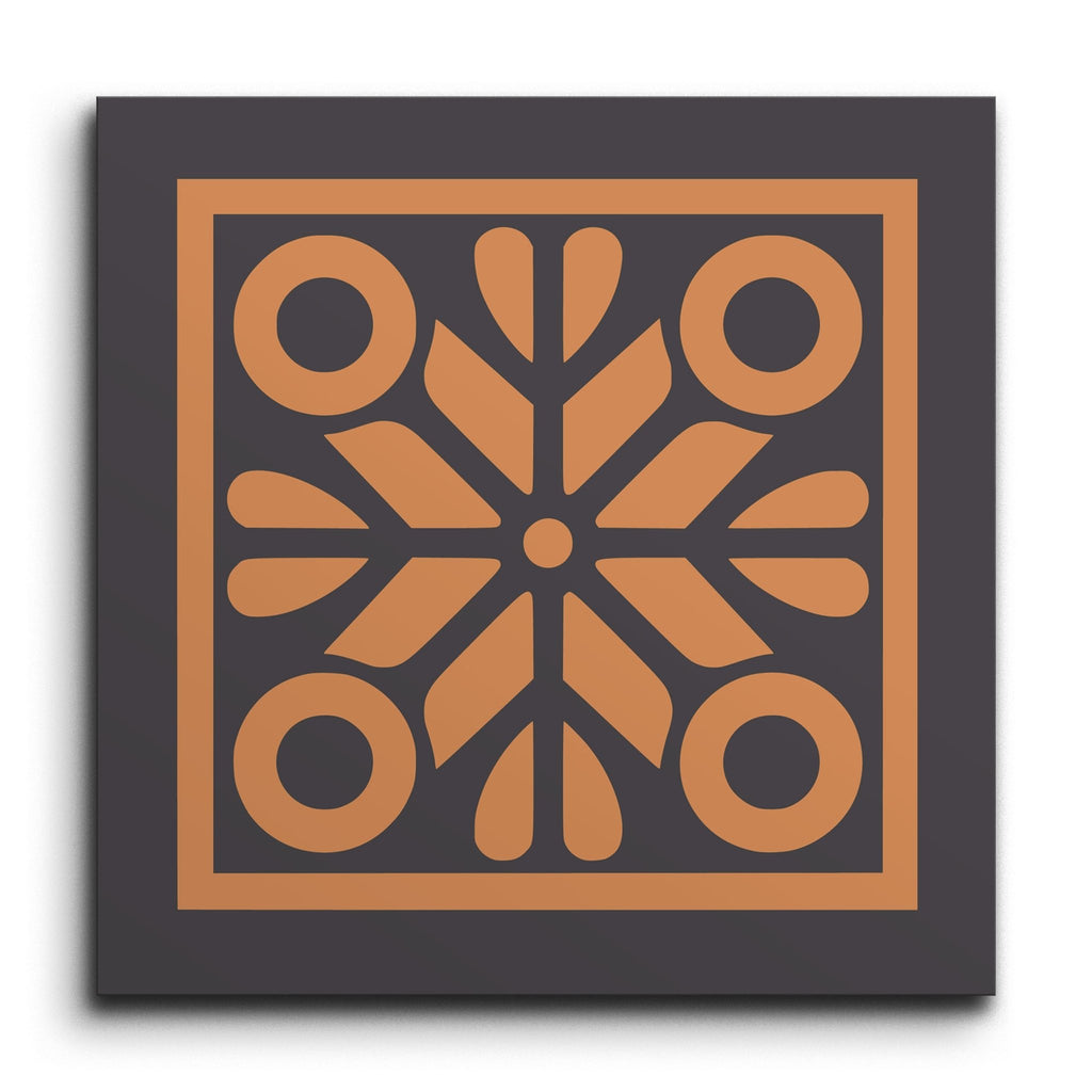 Deze decortegel toont een boeiend symmetrisch patroon, waar gedurfde geometrische vormen samenkomen in een opvallende radiale opstelling. In het hart van het ontwerp dragen cirkelvormige en bloembladachtige elementen bij aan de harmonieuze en evenwichtige esthetiek. De warme terracotta- en diep houtskoolgrijze kleuren roepen een klassieke en aardse sfeer op, die doet denken aan traditionele encaustische tegels die worden geprezen om hun ingewikkelde en levendige patronen.