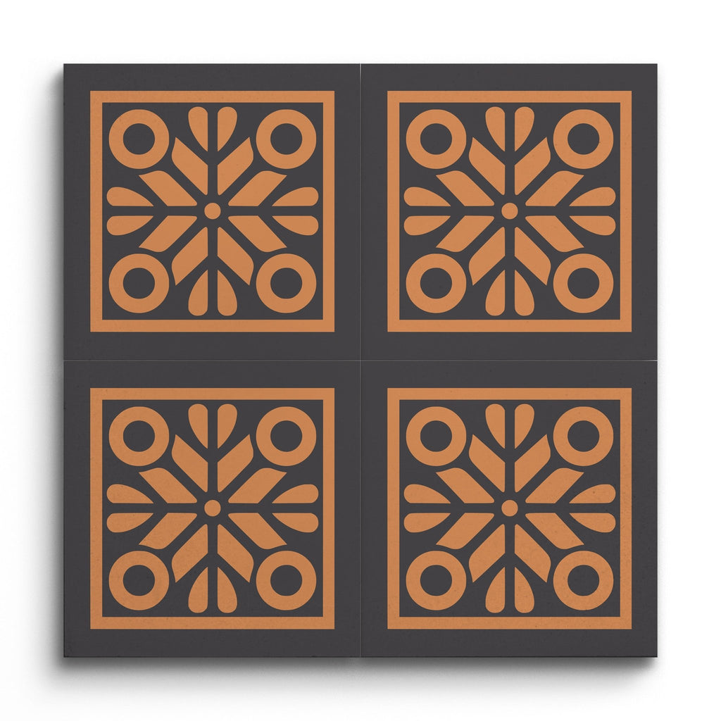 Deze decortegel toont een symmetrisch ontwerp met ingewikkelde geometrische vormen en cirkelvormige motieven, die de essentie van traditionele encaustische tegels vastleggen. Een warme terracottakleur steekt af tegen een diep houtskoolkleurige achtergrond, wat een opvallend contrast creëert. Het ontwerp is elegant omlijst door een rand, wat bijdraagt aan zijn klassieke en tijdloze charme. Zijn gedurfde, opvallende verschijning brengt een vintage tintje in elke omgeving.