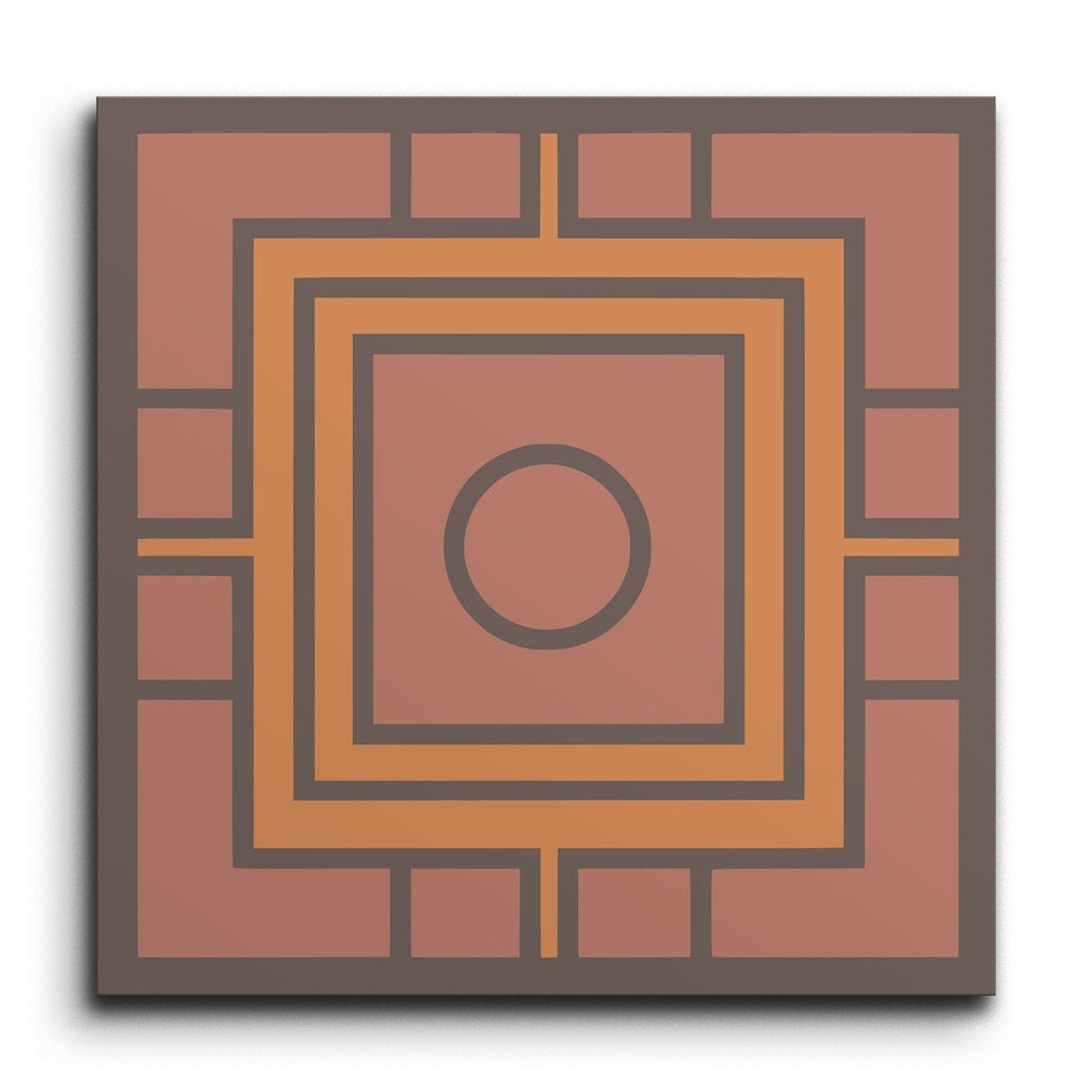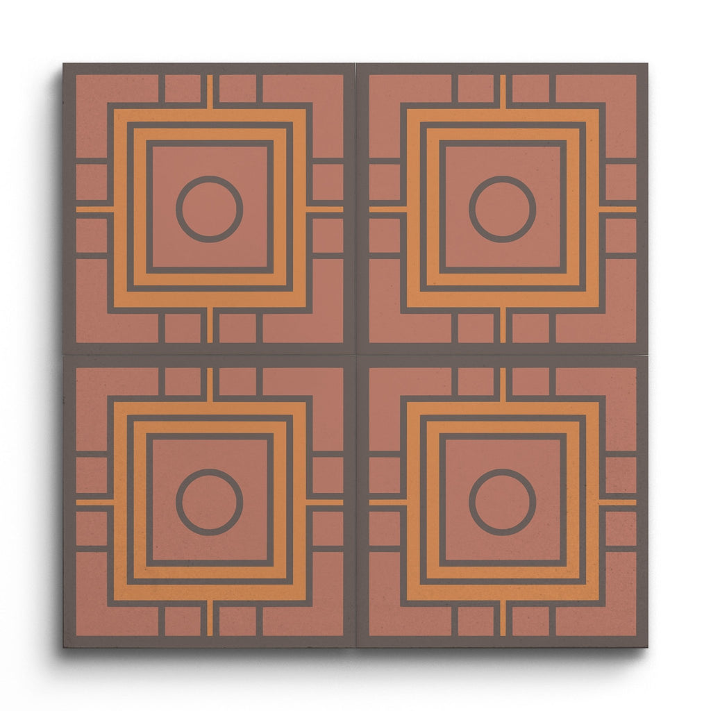 Deze decortegel toont een boeiend geometrisch patroon, met concentrische vierkanten die een centrale cirkel omlijsten voor een harmonieuze en symmetrische esthetiek. De warme aardetinten van terracotta en gedempt oranje worden prachtig gecontrasteerd door diepbruine omlijningen, wat een opvallend visueel effect creëert. Het strakke, gestructureerde ontwerp belichaamt een moderne geometrische stijl, waarbij eenvoud en de elegantie van herhaling worden benadrukt.