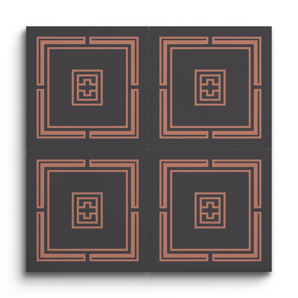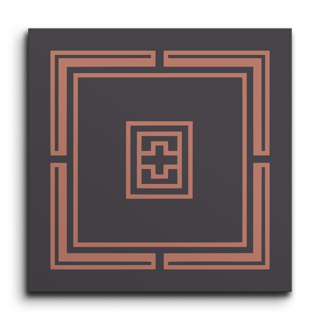 Deze decortegel toont een boeiend geometrisch patroon, waarbij concentrische vierkanten en rechthoeken elegant samenkomen rond een centraal kruisachtig motief. Het ontwerp komt tot leven door een rijk kleurenpalet, met koper- of terracottakleurige lijnen tegen een donkergrijze achtergrond, wat een gedurfde en opvallende contrast creëert. De strakke lijnen en symmetrische indeling bieden een gevoel van harmonie en precisie, waardoor het een opvallend stuk is in elke omgeving.
