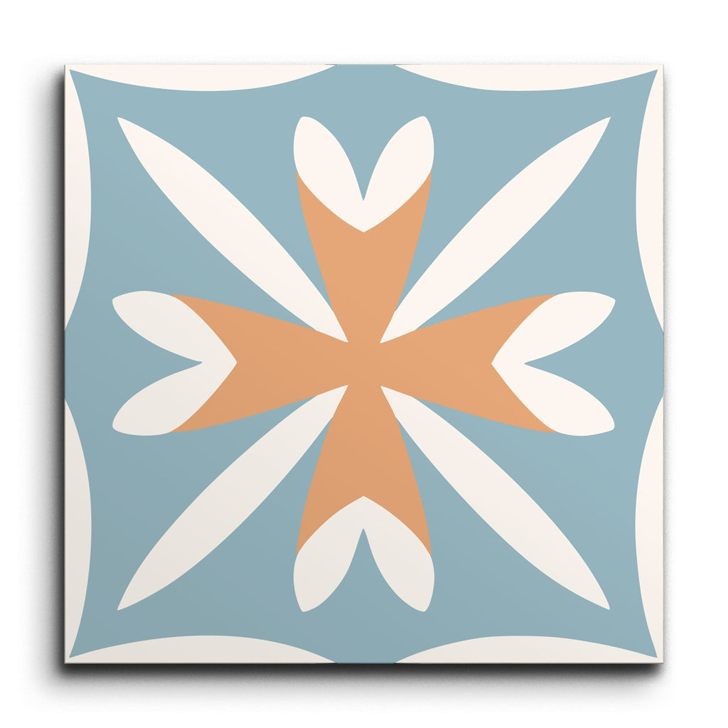 Deze decortegel toont een symmetrisch patroon met een centraal sterachtig motief in een warme terracottakleur. Daaromheen bevinden zich delicate bloembladachtige vormen in wit, allemaal geplaatst tegen een zachte blauwe achtergrond. Het ontwerp weerspiegelt traditionele encaustische tegels, bekend om hun ingewikkelde geometrische motieven. De gedempte, warme kleuren creëren een harmonieuze mix van klassieke charme en moderne elegantie.