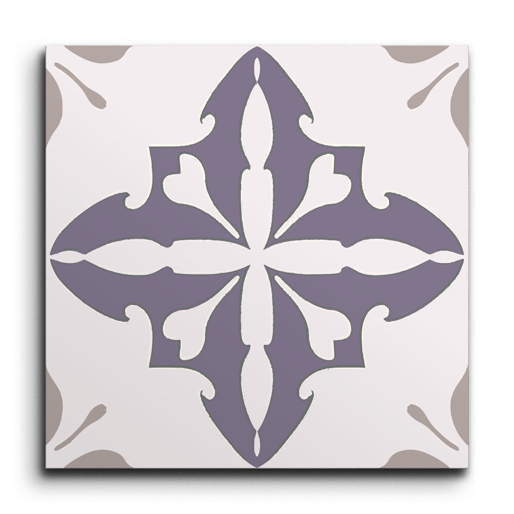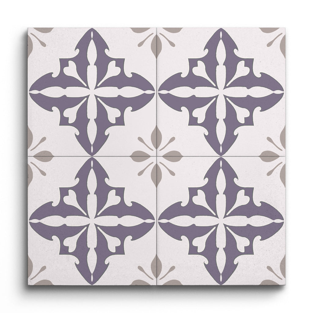 Deze decoratieve tegel toont een boeiend encaustisch patroon met een centraal geometrisch motief dat de aandacht trekt. Het ontwerp heeft een diep paarse kruisachtige figuur met sierlijke, gebogen extensies, wat een gevoel van diepte en complexiteit creëert. Subtiele taupe accenten versterken de complexiteit van het patroon, terwijl de zachte witte achtergrond voor een schoon contrast zorgt, waardoor het ontwerp opvalt. Het resultaat is een elegante en tijdloze esthetiek die verfijning aan elke ruimte toevoegt.
