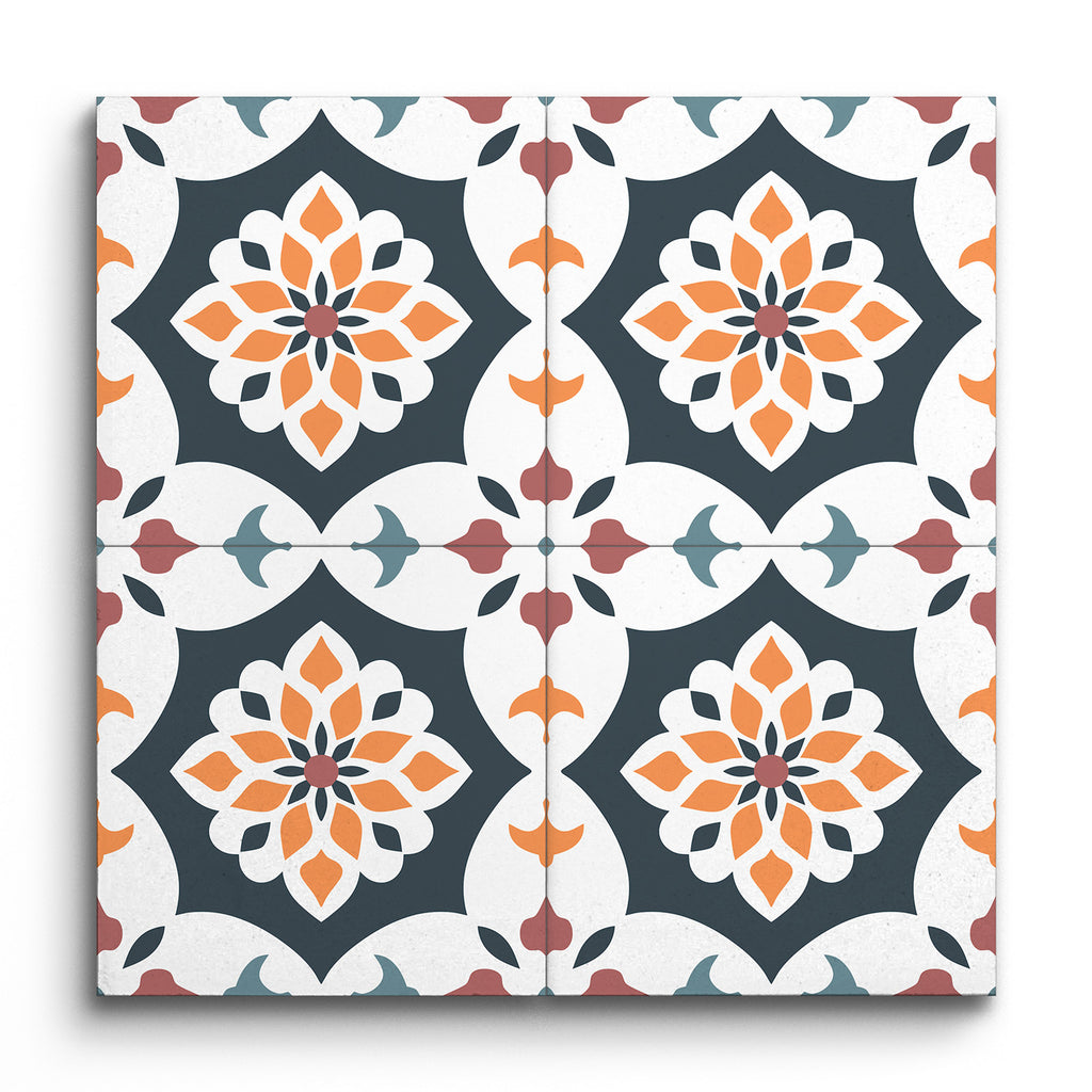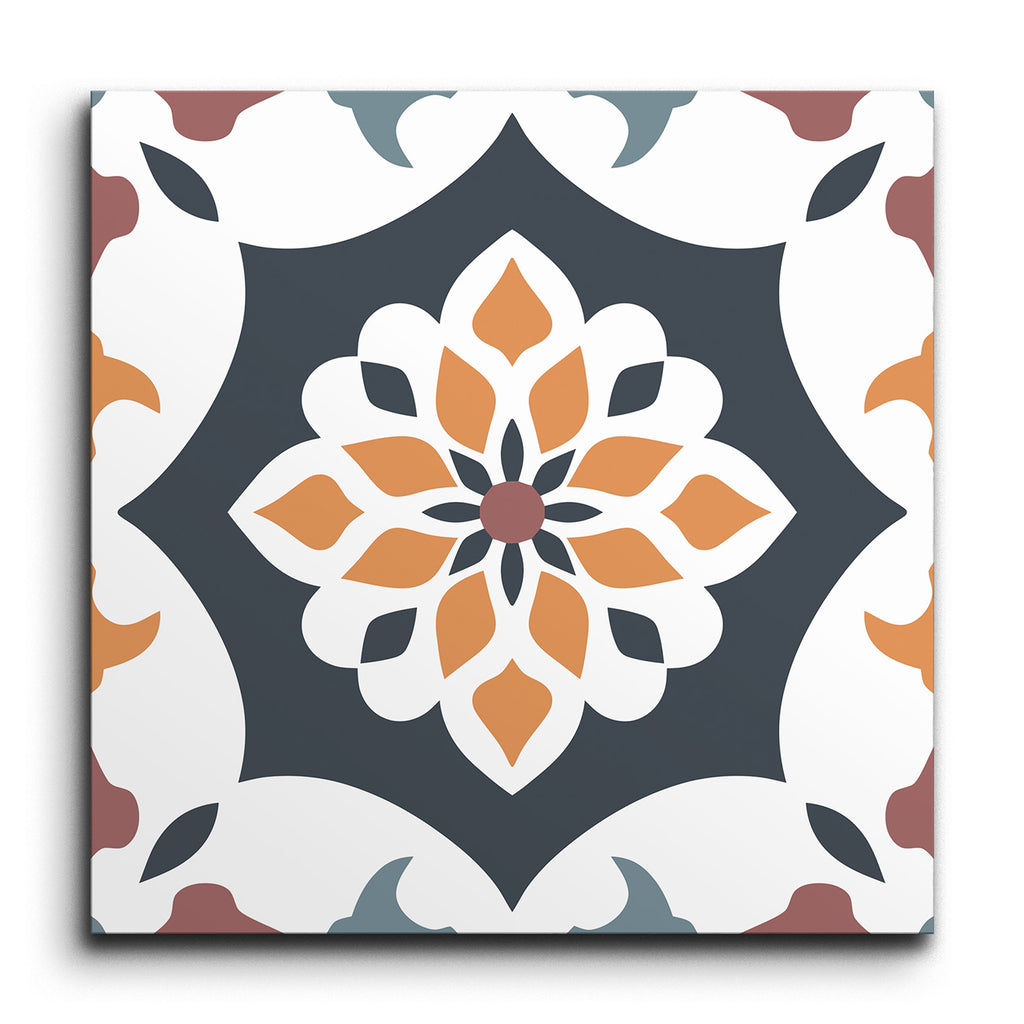 Deze Decoratie tegel toont een symmetrisch bloemontwerp dat is gecentreerd rond een elegant bloemenmotief. Het patroon is intricately gedetailleerd, met herhalende elementen die een gevoel van balans en harmonie oproepen. Gedempte en aardse tinten van donkergrijs, verbrande sinaasappel en zacht blauwgrijs zijn geplaatst tegen een witte achtergrond, wat een harmonieuze palet creëert. De algehele stijl is geïnspireerd op traditionele encaustische tegels, bekend om hun tijdloze en decoratieve aantrekkingskracht. Deze combinatie van kleuren en het klassieke bloemenmotief maakt het een veelzijdige keuze voor elke ruimte.