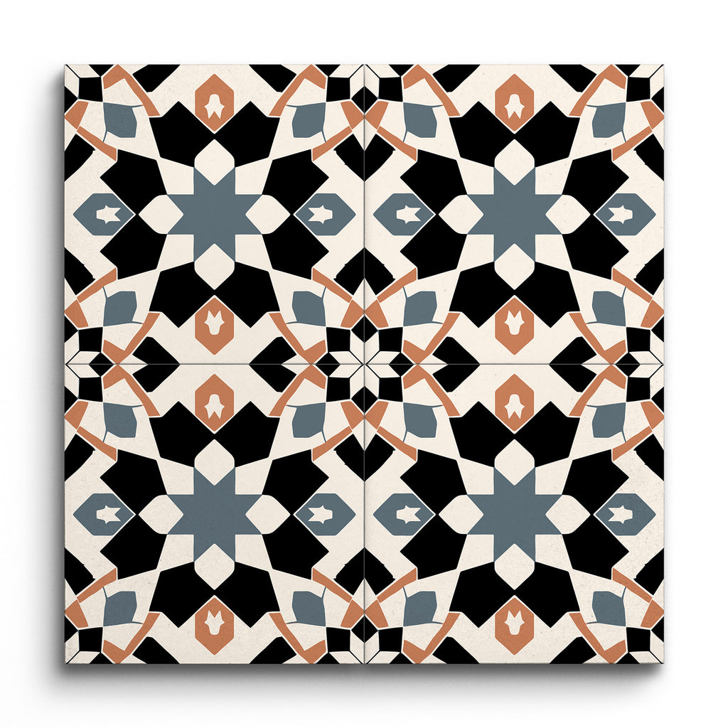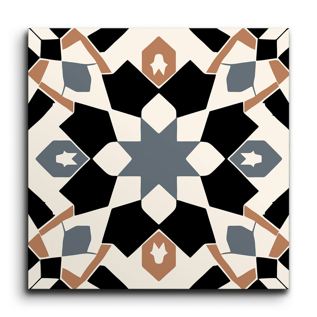 Deze decoratieve tegel toont een symmetrisch, geometrisch ontwerp dat de aandacht trekt met zijn gedurfde visuele aantrekkingskracht. Het palet van zwart, wit, grijs en bruin creëert een opvallend contrast, waardoor diepte en dimensie aan elke ruimte worden toegevoegd. In het hart bevindt zich een stervormig motief, intricately verbonden met omliggende hoekige en gebogen vormen, echoënd de tijdloze elegantie van traditionele encaustische tegels. De gedempte kleuren en klassieke patronen maken het een veelzijdige keuze, die naadloos past in verschillende Decoratie stijlen terwijl het een vleugje verfijning en charme toevoegt.