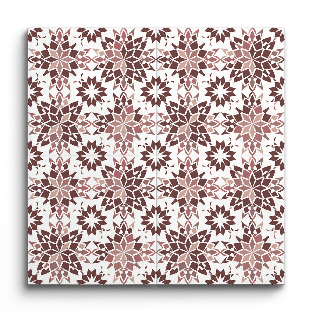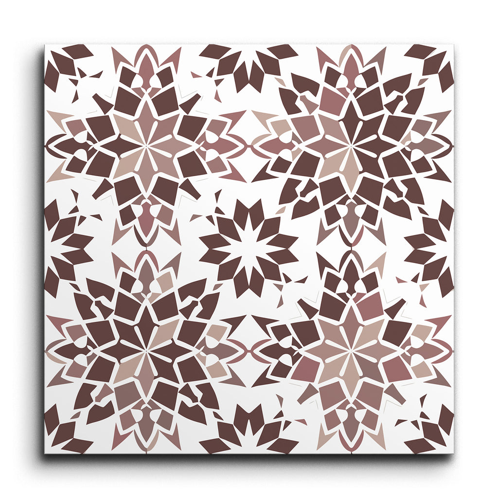 Deze Decoratie tegel toont een boeiend encaustisch patroon, waar ingewikkelde geometrische ontwerpen tot leven komen. Grote, sterachtige vormen met meerdere punten zijn harmonieus afgewisseld met kleinere, op dezelfde manier gestileerde sterren, wat een gevoel van beweging en balans creëert. Het kleurenpalet bevat een rijke mix van bruintonen, van lichtbeige tot diep chocolade, allemaal tegen een heldere witte achtergrond. Deze combinatie van kleuren en vormen resulteert in een visueel opvallend, symmetrisch patroon dat diepte en textuur aan elke ruimte toevoegt, waardoor het een perfecte keuze is voor degenen die op zoek zijn naar een vleugje tijdloze elegantie.