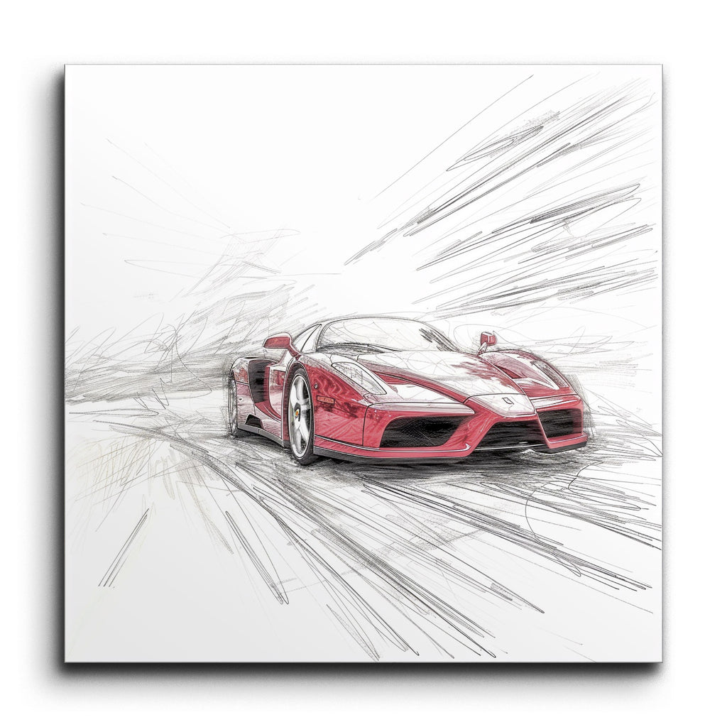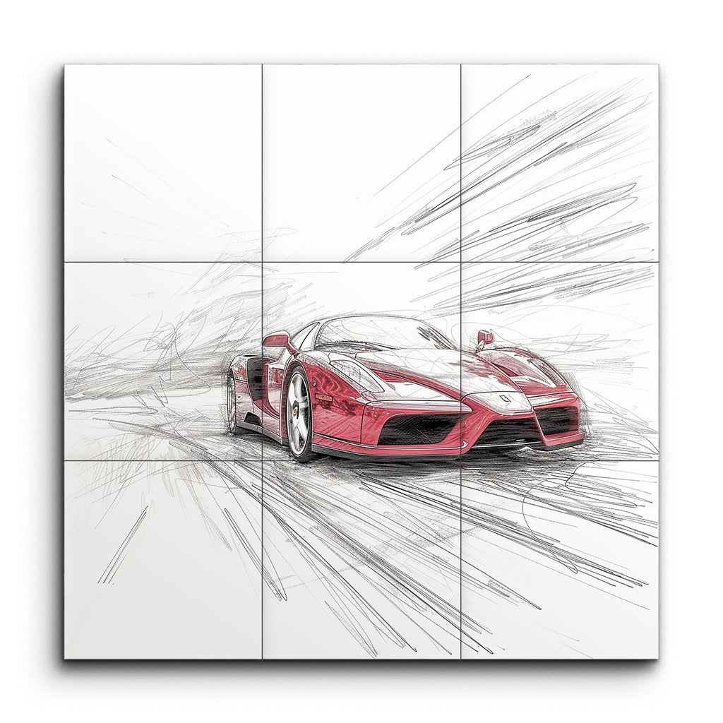 Deze tegelmuur geeft een slanke, rode sportwagen weer in een dynamische en energieke stijl. Lichtjes uit het midden geplaatst, lijkt de auto op volle snelheid naar de kijker toe te rijden, met nauwkeurige details die de rondingen, reflecties en aerodynamisch ontwerp benadrukken. De achtergrond bevat snelle, schetsachtige lijnen die naar buiten stralen, wat het gevoel van beweging en snelheid versterkt. De mix van realistische autodetails met abstracte, expressieve achtergrondlijnen creëert een indrukwekkend visueel effect, dat de kracht en snelheid van de auto benadrukt.