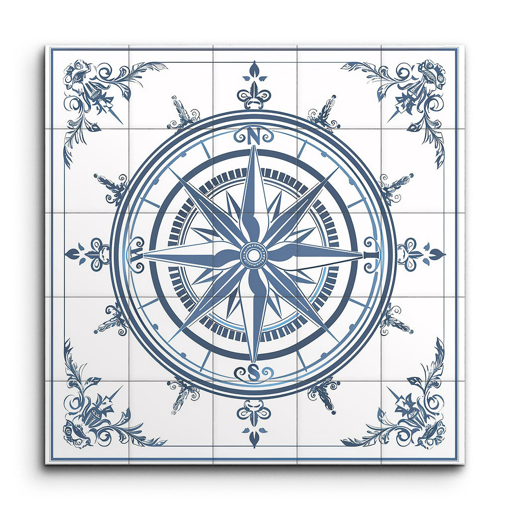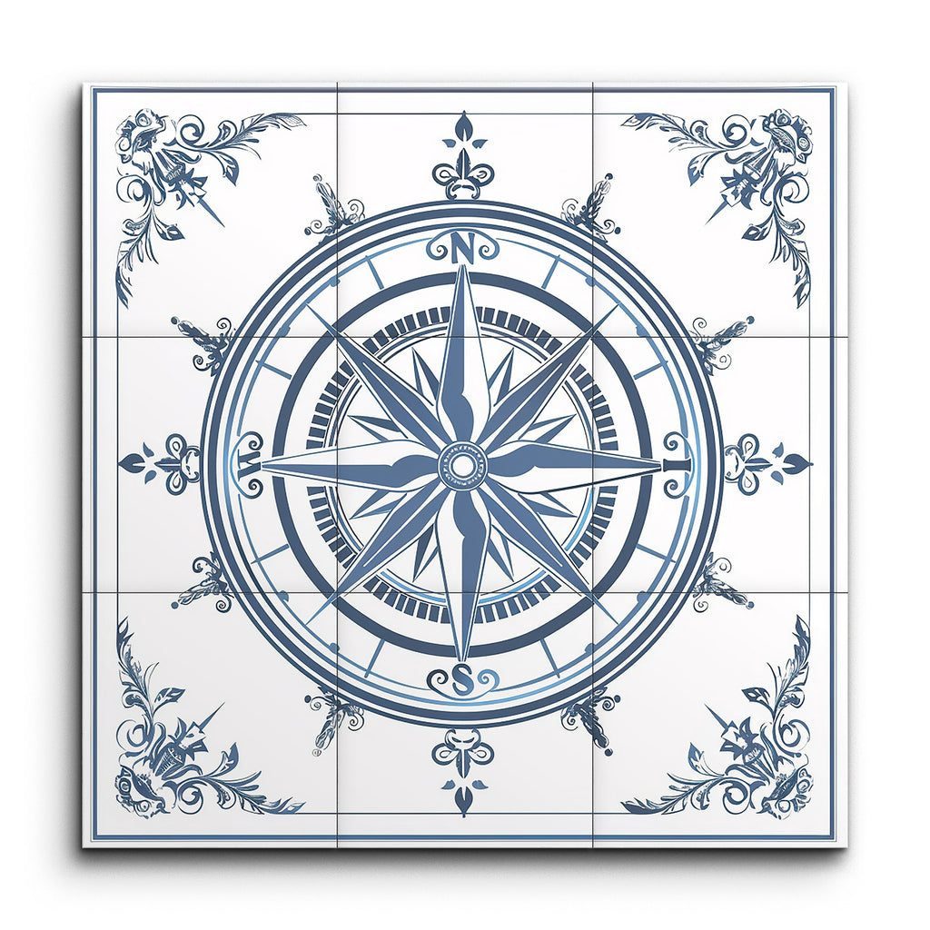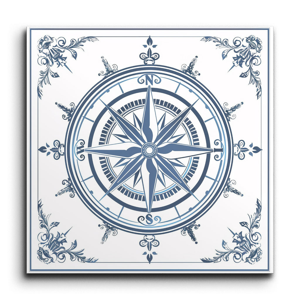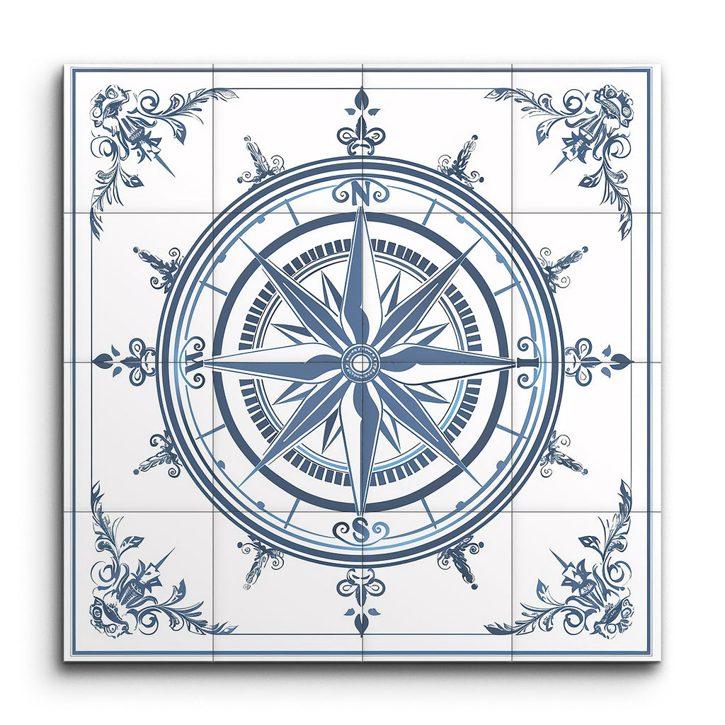 Ontdek de elegantie van onze tegelmuur, met een gedetailleerd en symmetrisch kompasroosontwerp. In het hart ligt een groot kompas met achtpuntige driehoeken in opvallende tinten blauw. Concentische ringen met ingewikkelde patronen voegen diepte en precisie toe, terwijl vier ornamentele bloemmotieven in de hoeken de delicate, handgetekende kwaliteit versterken. Dit kunstwerk, dat doet denken aan traditionele nautische kaarten en decoratieve tegels, brengt een vleugje historische elegantie en vakmanschap naar elke ruimte.