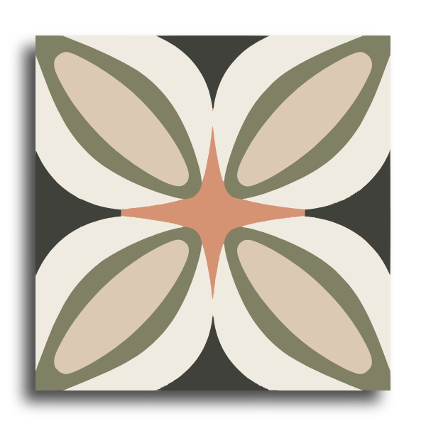 This decor tile showcases a captivating encaustic pattern with a central star-like motif surrounded by elegant, curved petal forms. The design is brought to life with a harmonious palette of earthy tones, featuring creamy hues, dusty blues, deep navy, and warm terracotta. These colors work together to create a vintage and timeless aesthetic, reminiscent of classic tile artistry. Perfect for adding a touch of traditional elegance to any space.