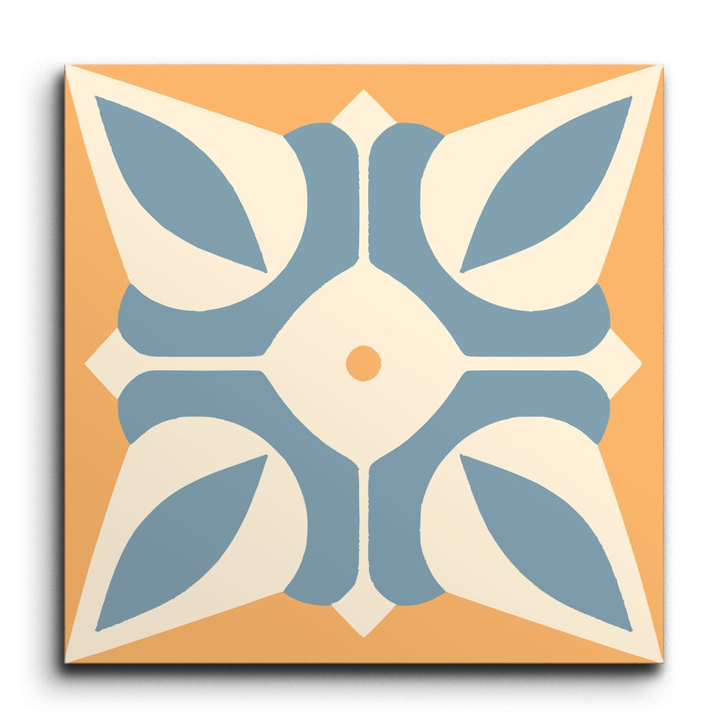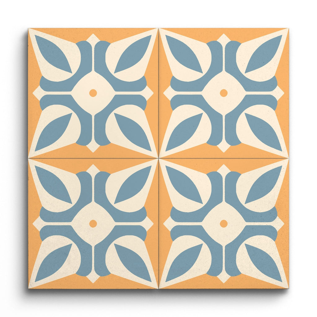 Deze decortegel toont een klassiek encaustisch patroon met een opvallend centraal motief, dat doet denken aan een gestileerde bloem of ster. De harmonieuze mix van gedempt blauw, zacht crème en warm oranje creëert een boeiend contrast, waarbij de geometrische vormen en vloeiende lijnen van het ontwerp worden benadrukt. Deze tegel balanceert prachtig tussen traditioneel vakmanschap en een moderne esthetiek, waardoor het een veelzijdige keuze is voor elke ruimte.