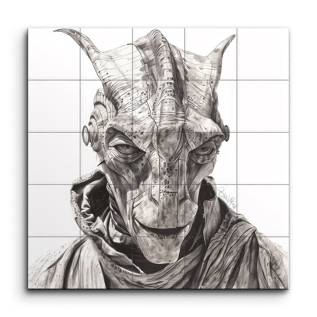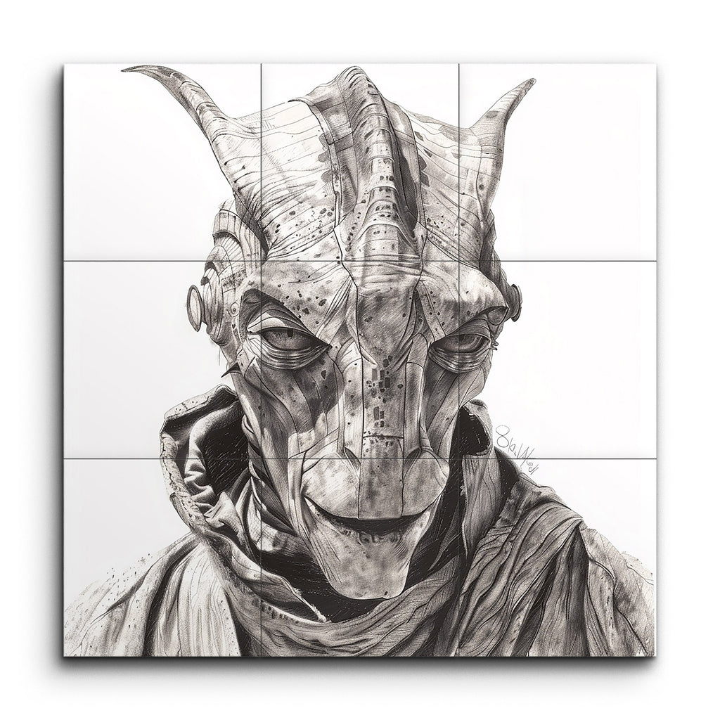 Transformeer uw ruimte met deze verbluffende tegelmuur met een hyper-realistisch portret van een raadselachtig humanoïde wezen. Het kunstwerk boeit met zijn ingewikkelde, pantserachtige plating versierd met hoornachtige uitsteeksels, gedetailleerde lijnen en klinknagels, wat een mechanische of exoskeletachtige uitstraling geeft. De intense blik van het wezen en het zorgvuldig geschaduwde, gedrapeerde kledingstuk voegen diepte en drama toe, terwijl het monochrome grijze palet de levensechte texturen en de scherpe, dramatische kwaliteit van het stuk versterkt. Ideaal voor degenen die op zoek zijn naar een unieke en meeslepende visuele ervaring.