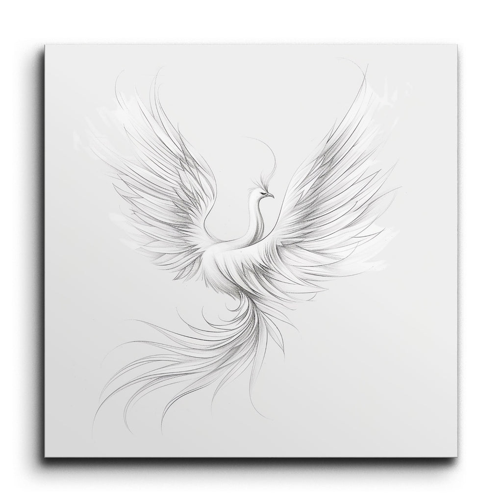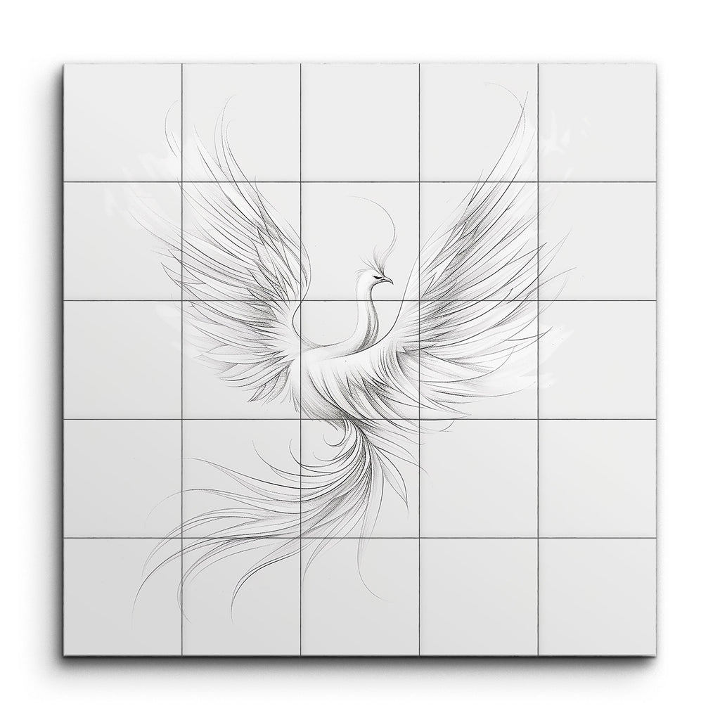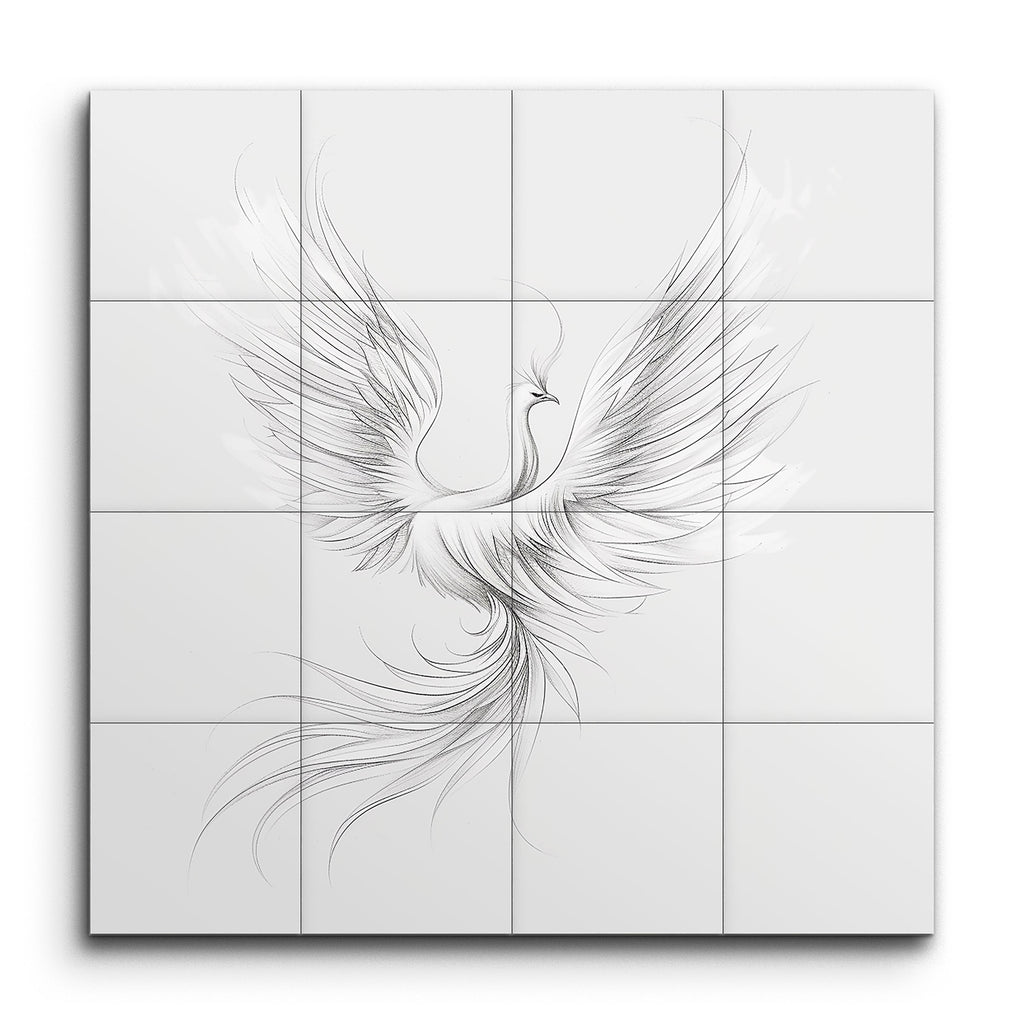Transformeer je ruimte met deze betoverende tegelmuur met een gracieuze feniks, afgebeeld in een minimalistische en etherische stijl. Fijne, delicate lijnen creëren een gevoel van beweging en vloeibaarheid, met uitgestrekte vleugels en luchtige, doorschijnende veren die lichtheid en luchtigheid oproepen. De lange, vloeiende staartveren dragen bij aan de beweging, terwijl het schone, verfijnde lijnwerk de mythische en majestueuze kwaliteiten van de feniks benadrukt. Dit serene en elegante kunstwerk brengt een moderne, harmonieuze touch in elke omgeving.
