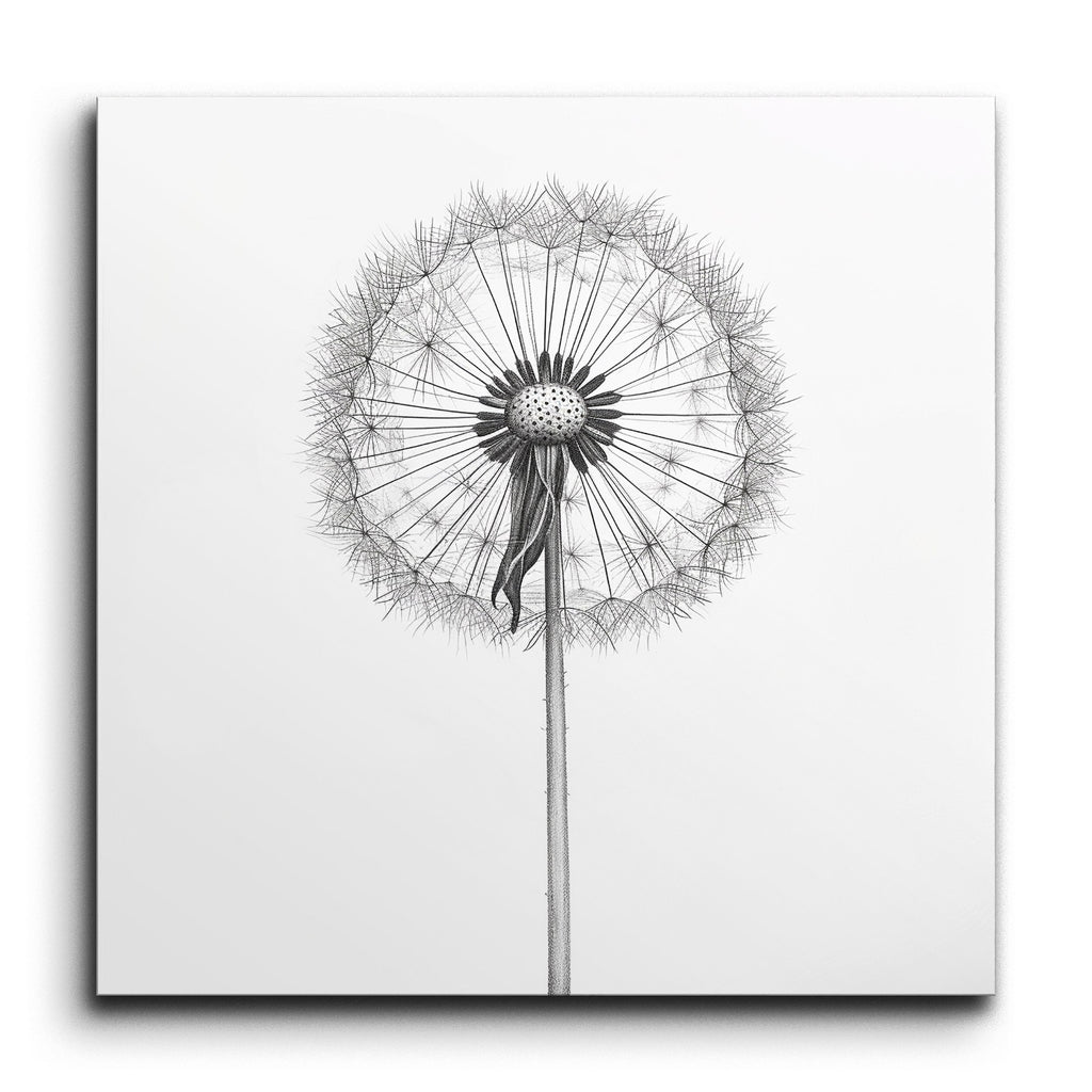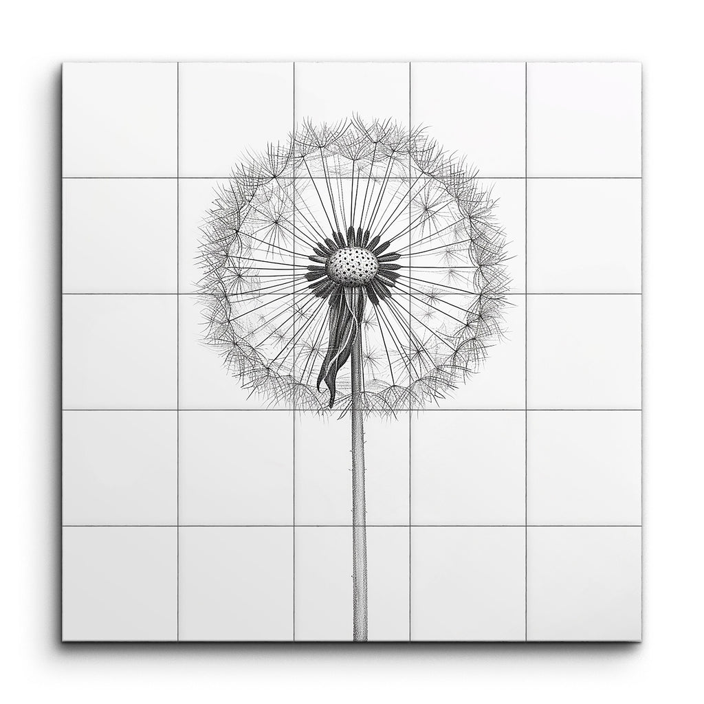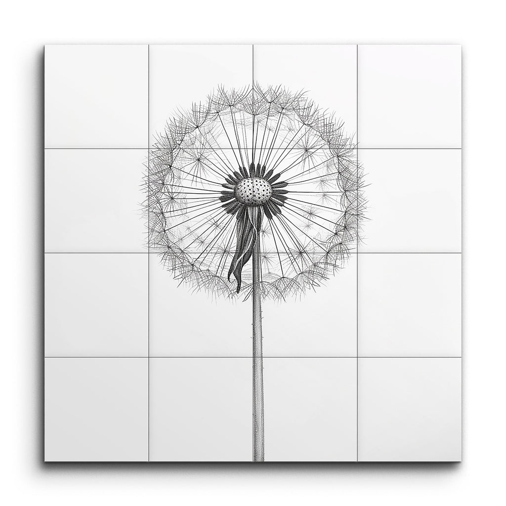 Transformeer uw ruimte met deze betoverende tegeltapijt, met een prachtig gedetailleerde illustratie van een paardenbloem in zijn zaadfase. Perfect gecentreerd stralen de ingewikkelde zaden van de paardenbloem uit van de textuurrijke centrale zaadkop, waardoor een fascinerend focal point ontstaat. De minimalistische, monochrome stijl benadrukt fijne lijnen en subtiele schaduw, wat een driedimensionale, bijna wetenschappelijke afbeelding van dit botanische wonder biedt. Ideaal voor iedereen die de delicate schoonheid en precisie van de natuur waardeert.