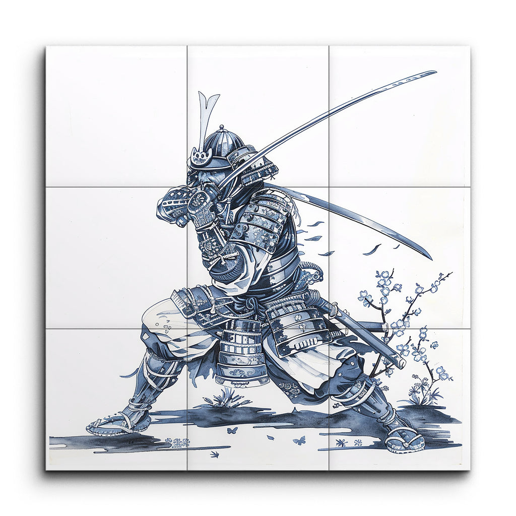 Deze tegelmuur bevat een samoerai krijger in een dynamische gevechtspositie, met twee zwaarden. Gekleed in traditionele, ingewikkeld gedetailleerde harnassen met een helmcrest, benadrukt het ontwerp het vakmanschap van de kleding. Weergegeven in een monochromatisch blauw dat doet denken aan traditionele Japanse inkttekeningen, geven de schaduwen en lijnwerk diepte en textuur aan de figuur en het harnas. Delicate takken van kersenbloesems op de achtergrond voegen een contrasterende zachtheid toe, met bloesems en bladeren die schijnbaar in de wind waaien. De natuurlijke omgeving, compleet met kleine planten en stenen, verankert het krachtige beeld en verenigt traditionele Japanse kunst met moderne illustratieve technieken.