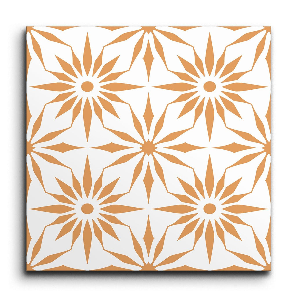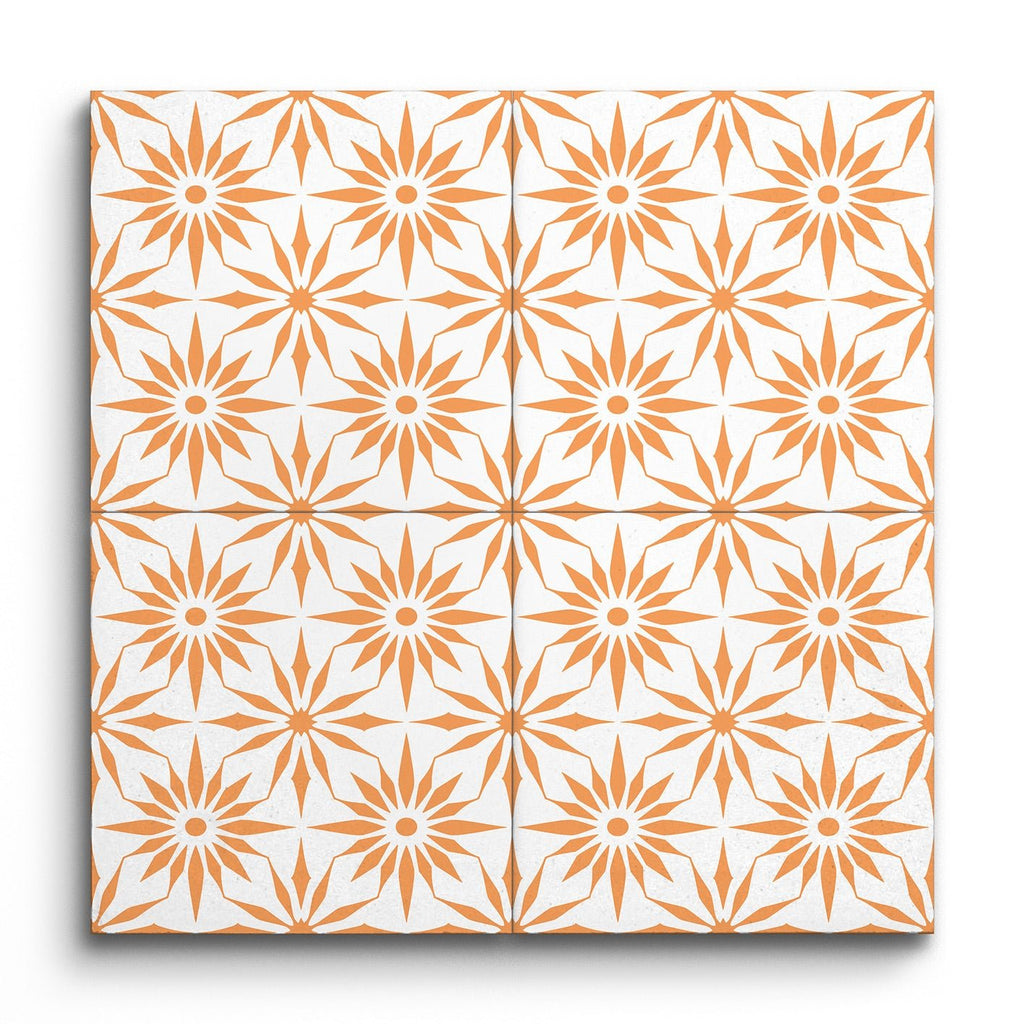 Deze Decoratie tegel toont een boeiend encaustisch patroon dat moeiteloos traditie mengt met een moderne esthetiek. Een reeks stervormige explosies, weergegeven in een warme, aardse oranje tint, vormt een harmonisch geometrisch ontwerp. Elke stervormige explosie, intricately gedetailleerd met puntige vormen die vanuit een centrale cirkel uitstralen, is zorgvuldig gerangschikt in een symmetrisch raster. De heldere witte achtergrond biedt een opvallend contrast, waardoor de oranje stervormige explosies echt opvallen. Het resultaat is een tegel die zowel gedurfdheid als elegantie uitstraalt, perfect om een vleugje historische charme en hedendaagse flair aan elke ruimte toe te voegen.
