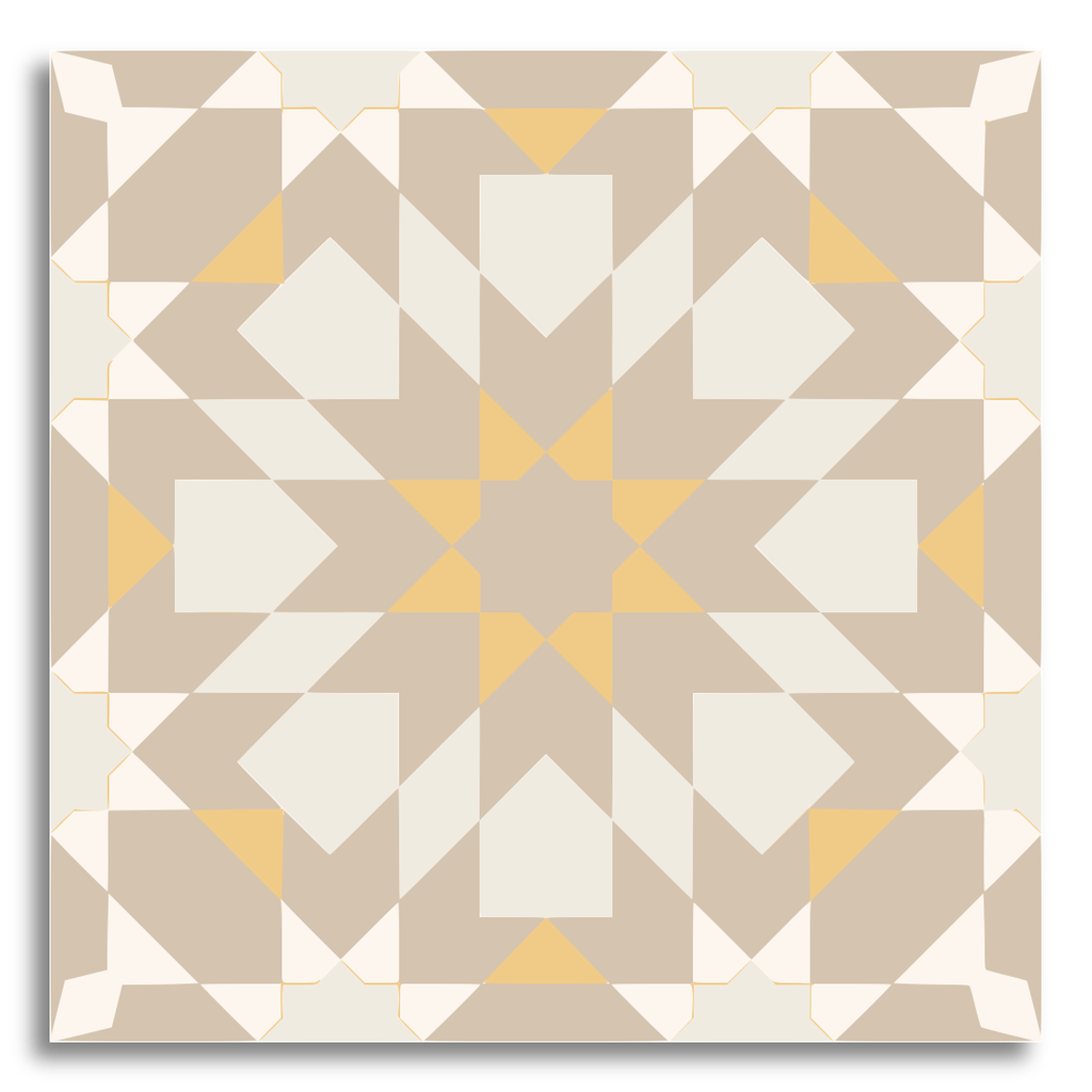 This decor tile showcases a captivating geometric design, characteristic of traditional encaustic styles. At its heart lies a star-like motif, formed by interlocking shapes that create an intricate and decorative pattern. The warm orange hues paired with crisp white offer a vibrant yet harmonious contrast, making it a visually striking piece. The repeating angular shapes add depth and complexity, drawing the eye and enhancing any space with its detailed artistry.