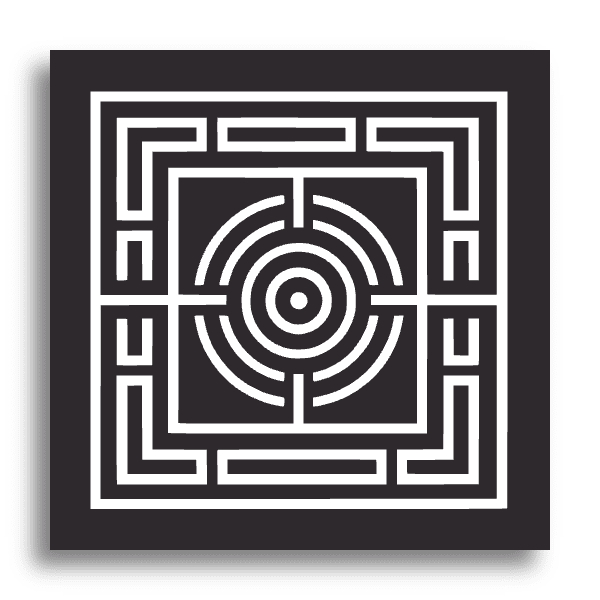 This decor tile showcases a captivating geometric pattern, centered around a series of concentric circles framed by a square border with crisp linear elements and right angles. The symmetrical and balanced design exudes a modern, minimalist charm. Its color scheme features a dark backdrop accented by lighter lines, creating a bold contrast that highlights the geometric forms. The result is a clean, precise look that fits seamlessly into contemporary spaces.