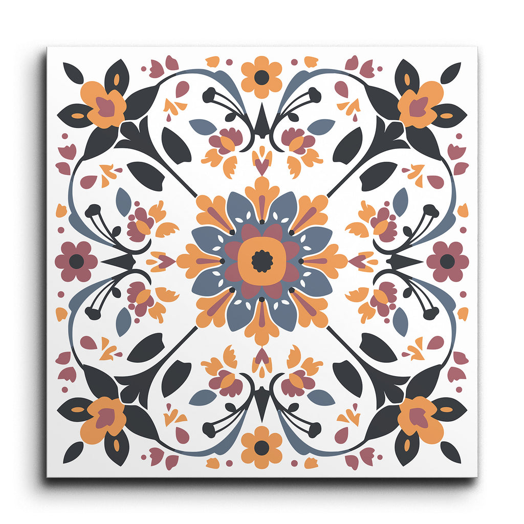 Infuse your space with the rich cultural heritage and vibrant energy of Mexican artistry through this stunning decor tile. The heart of the design features a large, symmetrical flower with petals in captivating shades of blue and orange, radiating outwards in a harmonious dance of color. Surrounding this central bloom are smaller floral elements in vivid red, orange, and black, each intricately detailed to create a sense of movement and life. The bold use of color and flowing lines bring a dynamic yet balanced feel to the pattern, effortlessly drawing the eye across the entire tile. The strategic use of black not only provides depth and contrast but also enhances the brilliance of the surrounding hues, making each color pop with intensity. This decor tile is more than just a decorative element; it's a celebration of Mexican craftsmanship and a vibrant addition to any space.