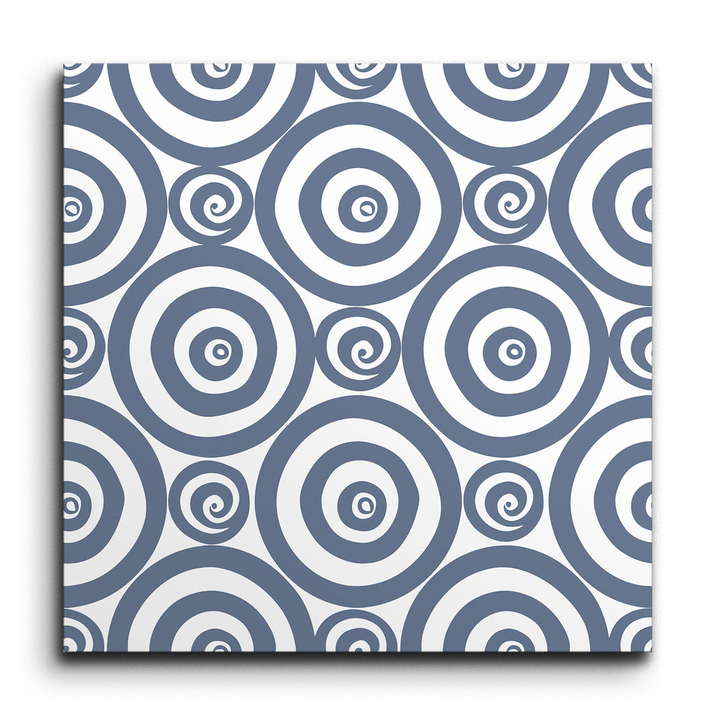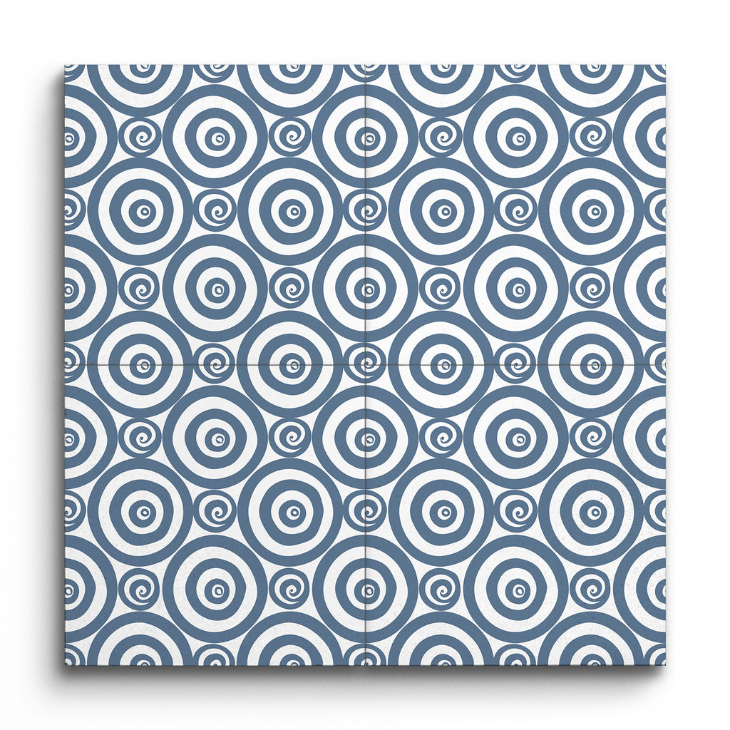 This decor tile showcases a captivating geometric pattern, where concentric circles and spirals dance in a repetitive sequence. The design brings together a deep navy blue and a stark white, creating a striking contrast that catches the eye. The variation in circle sizes, with larger circles punctuated by smaller spirals, adds a dynamic rhythm to the visual experience. The clean, bold lines and symmetrical arrangement lend a modern and sophisticated touch, ensuring that this tile stands out in any setting. Perfect for those who appreciate a blend of clarity and impact in their decor.