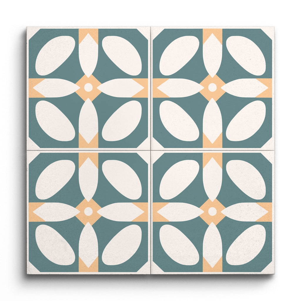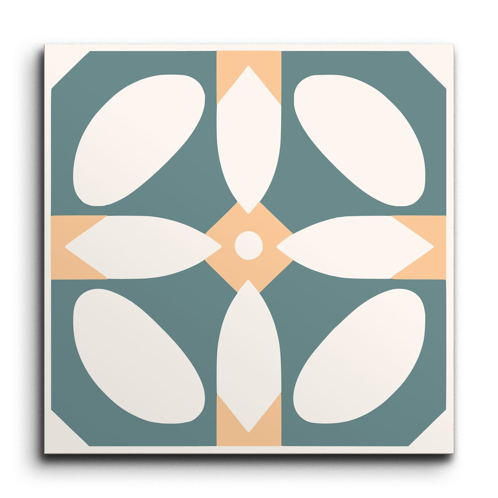 This decor tile showcases a beautifully symmetrical design centered around a geometric motif, capturing the essence of traditional encaustic tiles. The palette combines muted teal, soft cream, and warm peach, blending seamlessly to offer a harmonious and balanced aesthetic. The interplay of rounded and angular shapes adds a classic charm, while the overall design maintains a timeless elegance. The colors and patterns come together to evoke a sense of subtle sophistication, making it a perfect addition to any space seeking a touch of refined style.