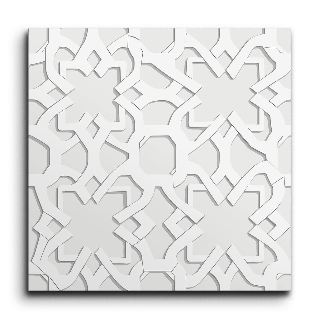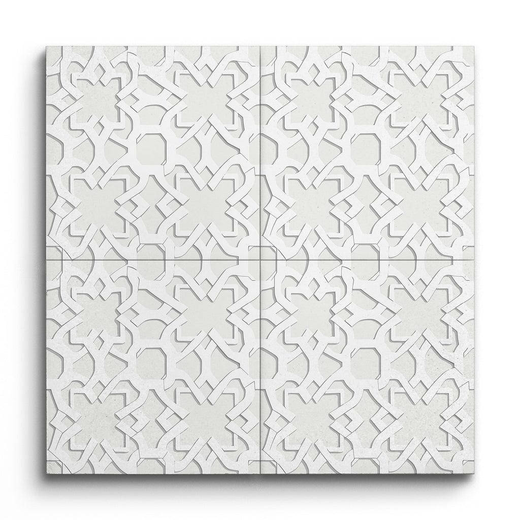 This decor tile showcases an intricate geometric design, where interlocking shapes and lines come together to form a visually captivating pattern. The repeating symmetrical forms create a sense of depth and complexity, adding a touch of sophistication to any space. The color palette, featuring primarily white and light gray, imparts a clean and modern aesthetic, making it a versatile choice for various interior styles. The overlapping and interwoven elements lend a three-dimensional effect, enhancing its dynamic appeal. The precise lines and cohesive pattern reflect a harmonious balance, making this tile a standout piece in any decor.
