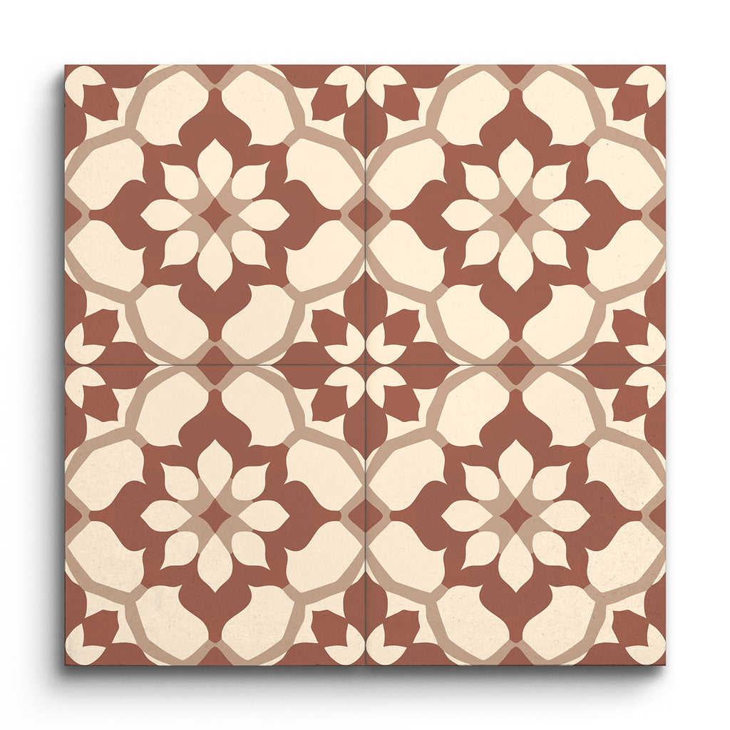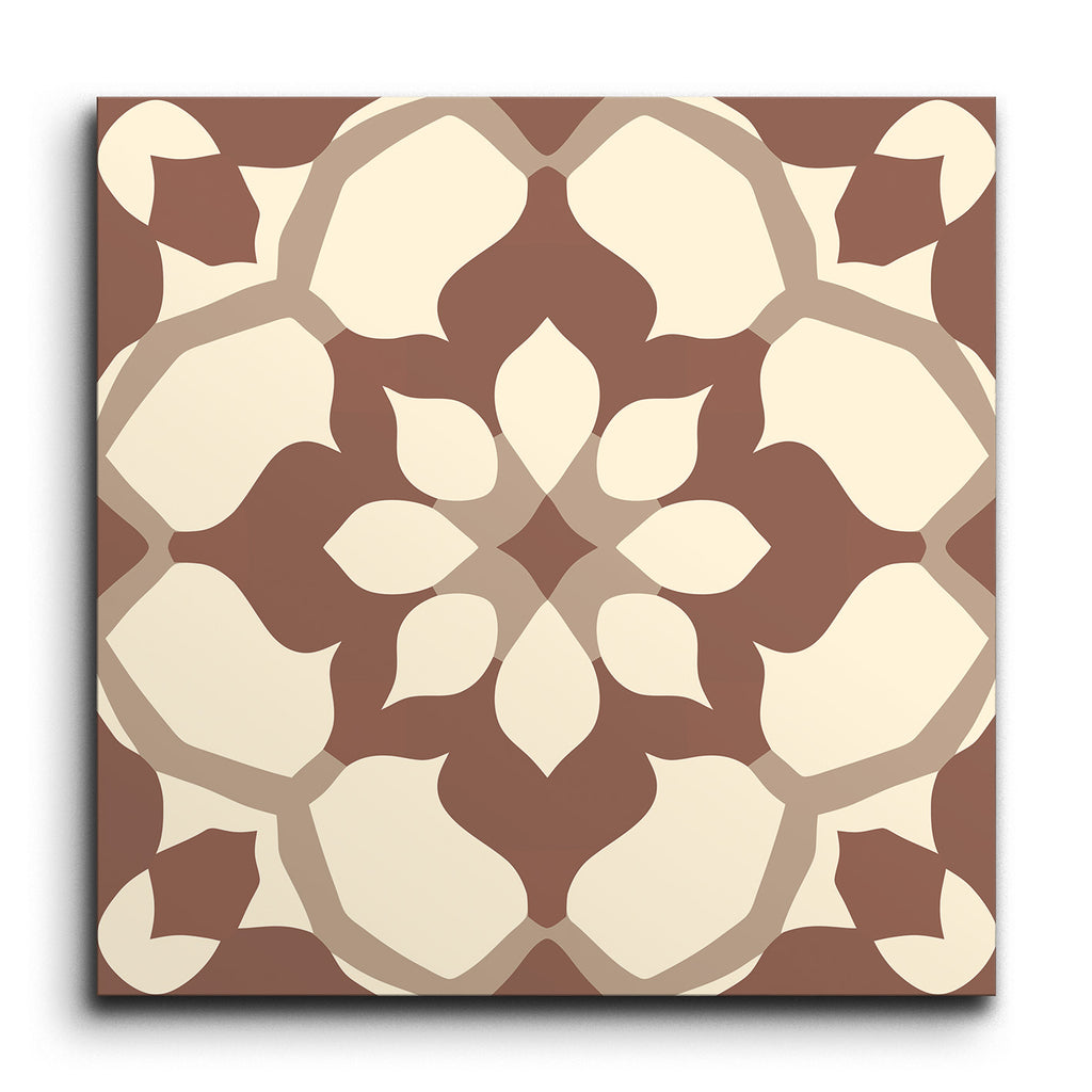 Introducing a decor tile that captures the essence of traditional craftsmanship with its symmetrical, floral-inspired design. This encaustic style tile features petal-like shapes meticulously arranged in a radial pattern, bringing a sense of balance and harmony to any space. The warm shades of brown and beige create a timeless aesthetic, while the contrasting colors emphasize the intricate details, making this tile a striking and elegant addition to your decor. Perfect for those who appreciate the beauty of classic patterns and the charm of handcrafted artistry.
